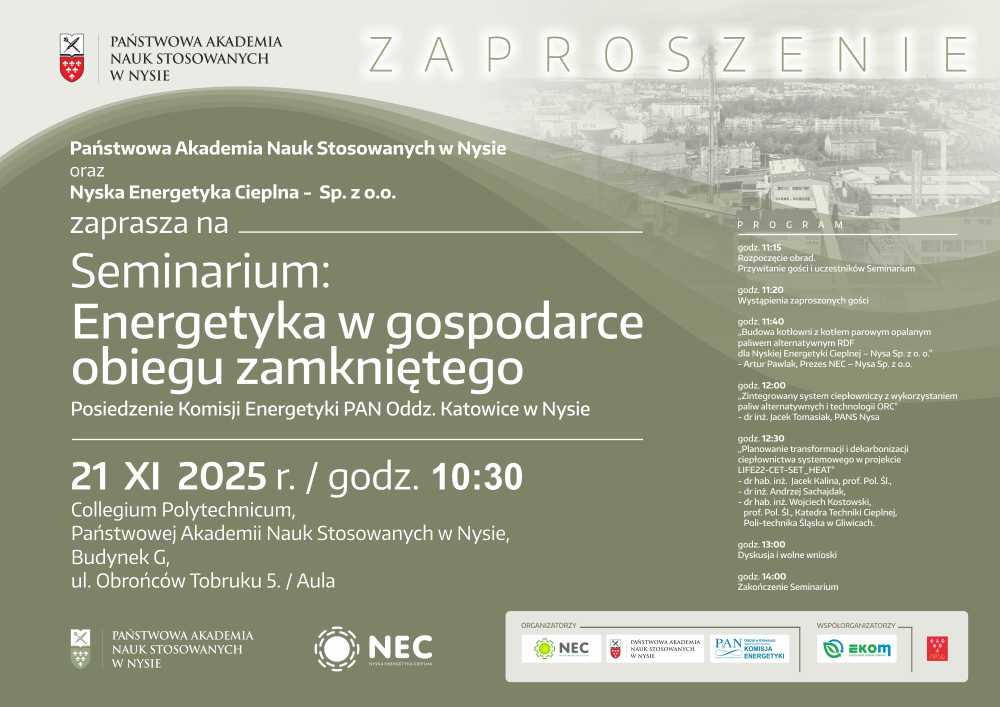 Serdecznie zapraszamy do udziału w seminarium „Energetyka w gospodarce obiegu zamkniętego”, które odbędzie się 21.11.2025 r. Wydarzenie poświęcone będzie roli sektora energetycznego w transformacji w kierunku gospodarki o obiegu zamkniętym (GOZ) – modelu, w którym efektywne wykorzystanie zasobów, ograniczanie odpadów i redukcja emisji stają się kluczowymi elementami zrównoważonego rozwoju.