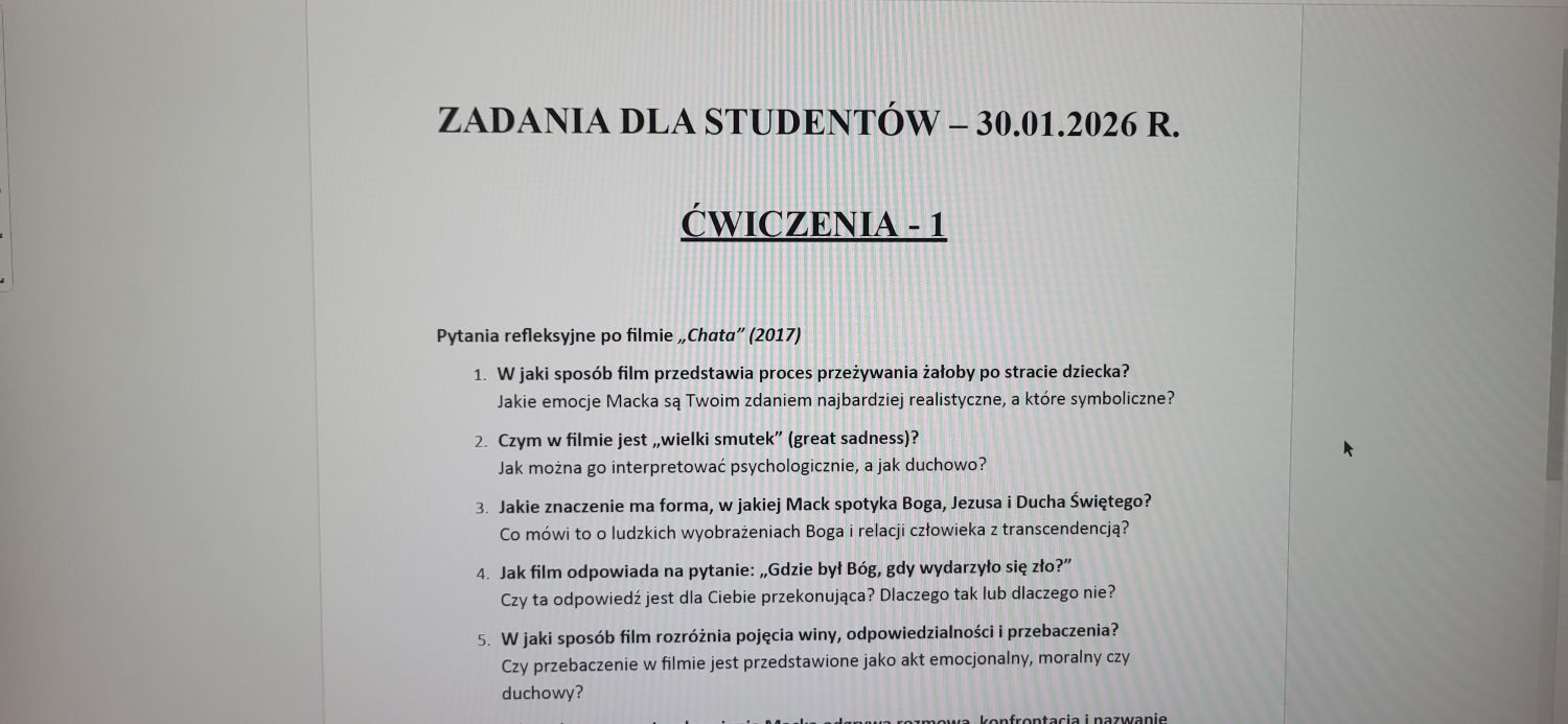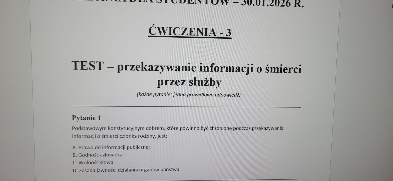 W trakcie spotkań studenci rozwiązywali różne problemy, z którymi mogą zetknąć się w pracy w administracji. Jednym z nich jest sytuacja, kiedy trzeba poinformować rodzinę o śmierci osoby najbliższej. Studenci uczyli się informowania rodziny o śmierci bliskiego przez przedstawiciela służb, policji czy wojska według modelu/protokołu GRIEV_ING. Poza ćwiczeniami - aby wprowadzić się w temat śmierci i jej tajemnicy - studenci obejrzeli film "Chata" z 2017 roku. Po filmie na podstawie 10 pytań przygotowanych przez dr Piątka, studenci prowadzili rozważania na temat: empatii, odpowiedzialności, nadziei, przebaczania oraz zła. Dodatkowo wypełniali testy z zakresu wiedzy protokolarnej GRIEV_ING, usłyszeli pogadankę o tym protokole oraz wysłuchali doświadczeń wykładowcy z pracy w służbach.