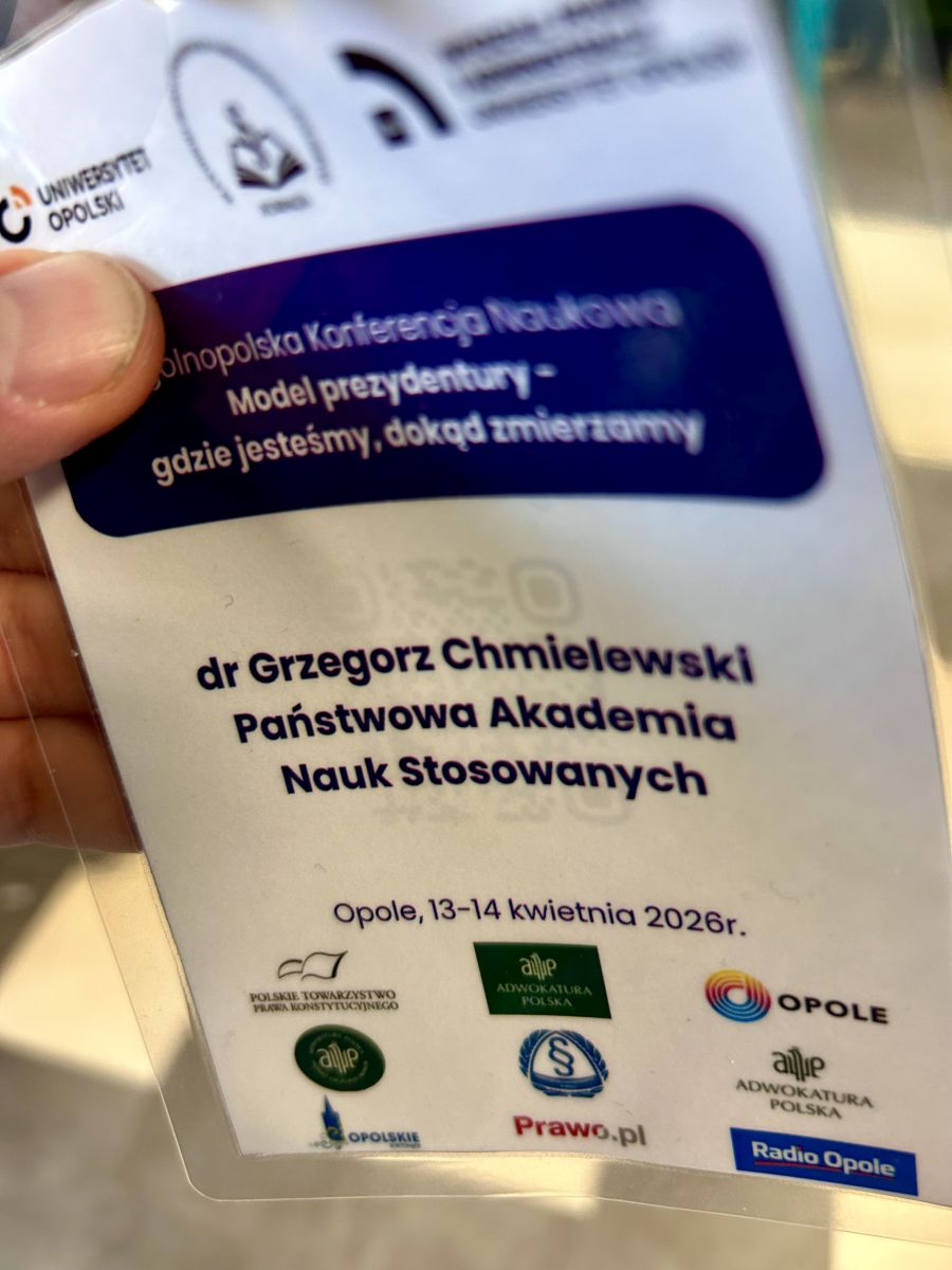 Dr Grzegorz Chmielewski, adiunkt Wydziału Nauk Społecznych wziął udział w Ogólnopolskiej Konferencji Naukowej pt. "Model prezydentury- gdzie jesteśmy, dokąd zmierzamy", która odbyła się 13-14.04.2026 roku na Wydziale Prawa i Administracji Uniwersytetu Opolskiego. Konferencja poświęcona była obecnej pozycji ustrojowej głowy państwa i wszystkim aspektom prawnym w tym zakresie. W tym naukowym spotkaniu uczestniczyło wielu wybitnych konstytucjonalistów z całej Polski i stanowiło ono forum wymiany poglądów i doświadczeń przedstawicieli środowiska naukowego oraz praktyków prawa.