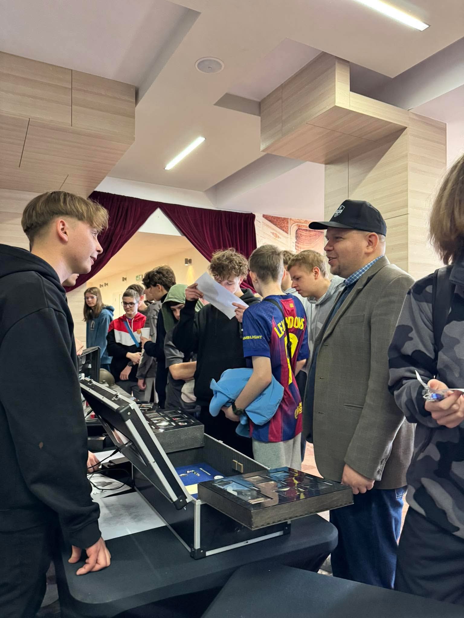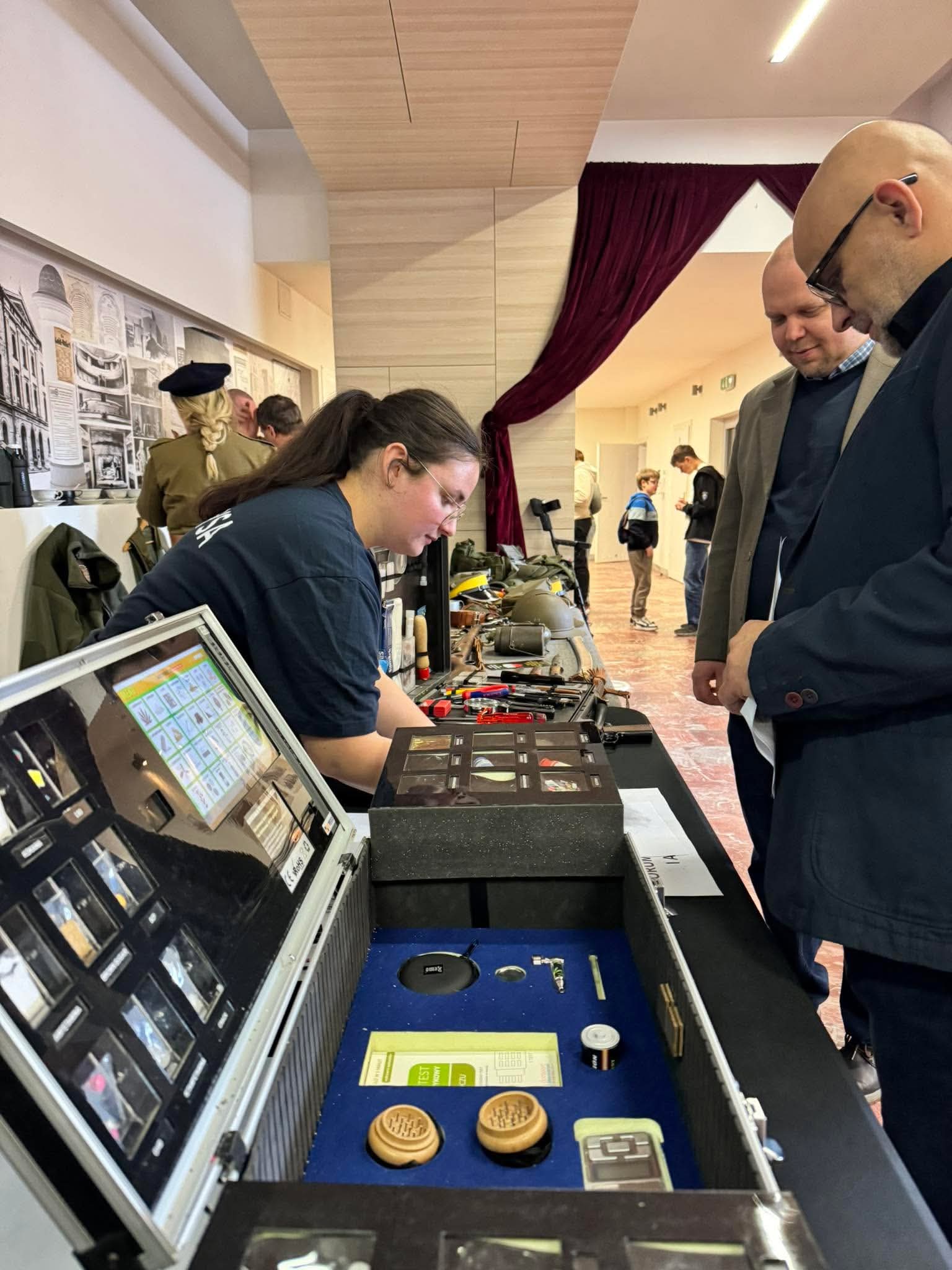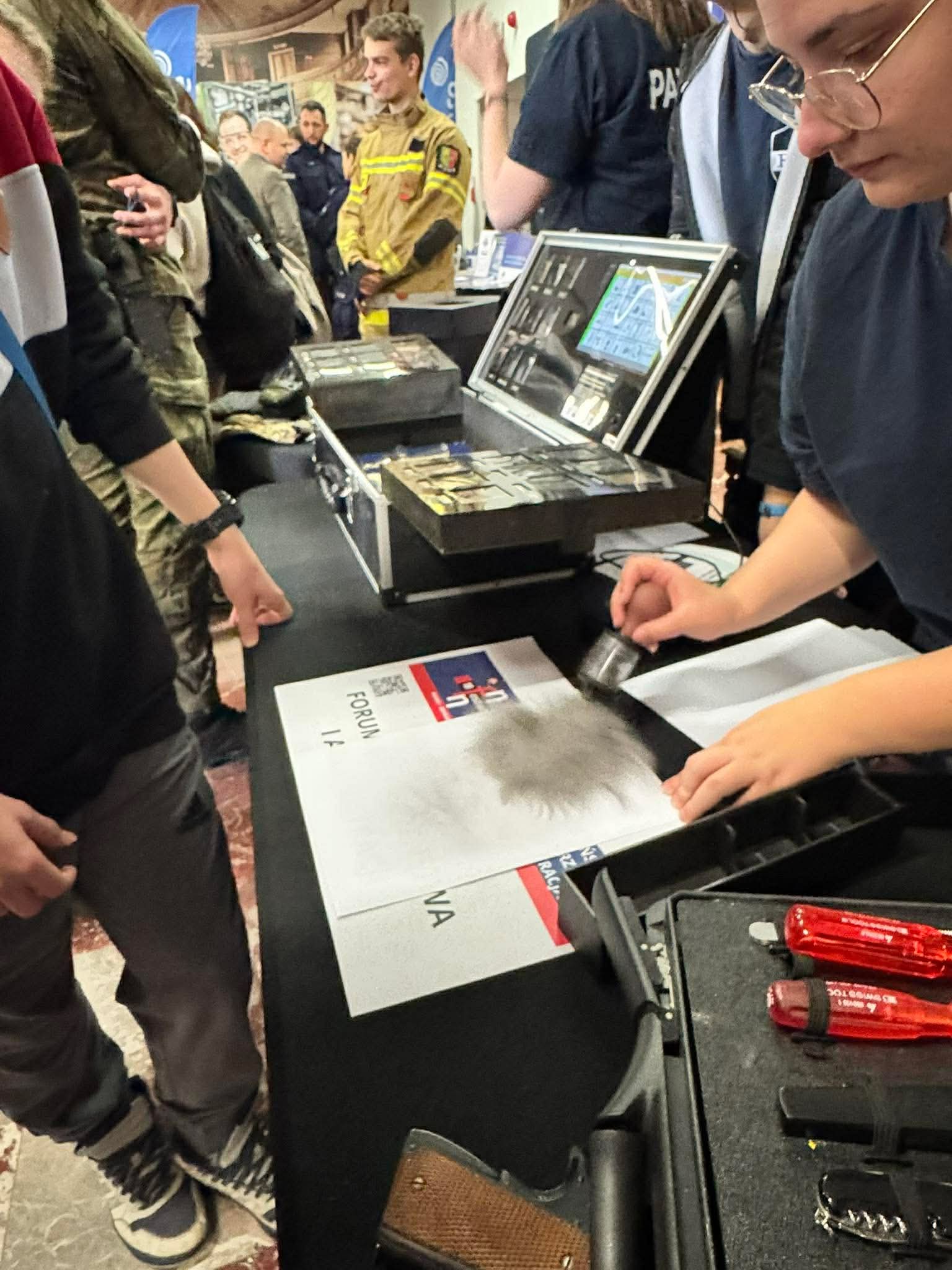 Na naszym stanowisku odwiedzający mogli zapoznać się z teczką kryminalistyczną – profesjonalnym zestawem narzędzi wykorzystywanym przez ekspertów policja w pracy na miejscu zdarzenia. Dużym zainteresowaniem cieszyły się również pokazy metod wykrywania śladów przestępstw, w tym daktyloskopii, czyli technik ujawniania i analizy odcisków palców Uczestnicy mieli okazję zobaczyć, jak w praktyce wygląda zabezpieczanie materiału dowodowego.
