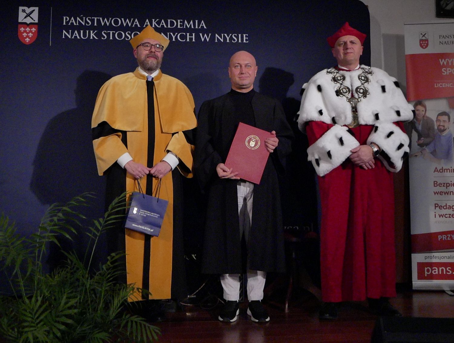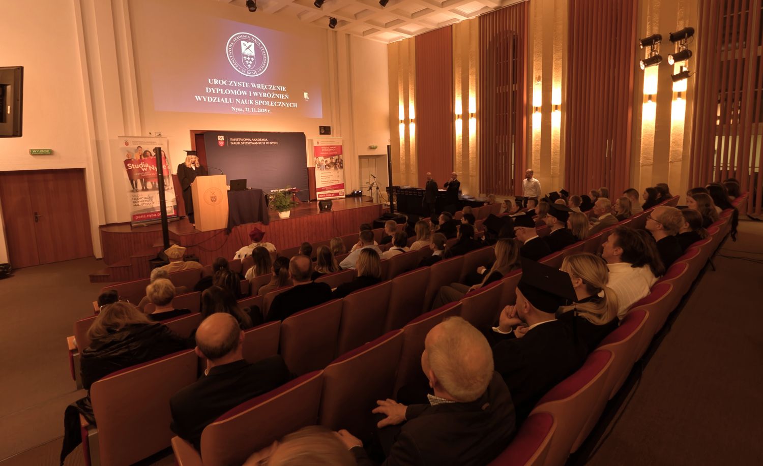 21-go listopada w Auli Uczelni miała miejsce uroczystość wręczenia dyplomów ukończenia studiów absolwentom studiów licencjackich na kierunkach administracja i bezpieczeństwo wewnętrzne oraz absolwentom studiów magisterskich na kierunku bezpieczeństwo wewnętrzne. Jego Magnificencja Rektor prof. Mariusz Kołosowski pogratulował absolwentom i podkreślił znaczenie ich kompetencji dla rozwoju rynku pracy, jak również dla lokalnego i regionalnego bezpieczeństwa. Dziekan Wydziału Nauk Społecznych prof. Tomasz Drewniak zwrócił uwagę na rolę Władz Uczelni, nauczycieli akademickich oraz pracowników administracji i obsługi dla sprawnego funkcjonowania Wydziału i komfortu studiowania. W imieniu absolwentów głos zabrali Pani lic. Magdalena Pasiniewicz oraz Pan mgr Jakub Płowucha, dziękując nauczycielom akademickim i promotorom oraz wskazując na wysoką jakość kształcenia i indywidualne podejście do studentów.