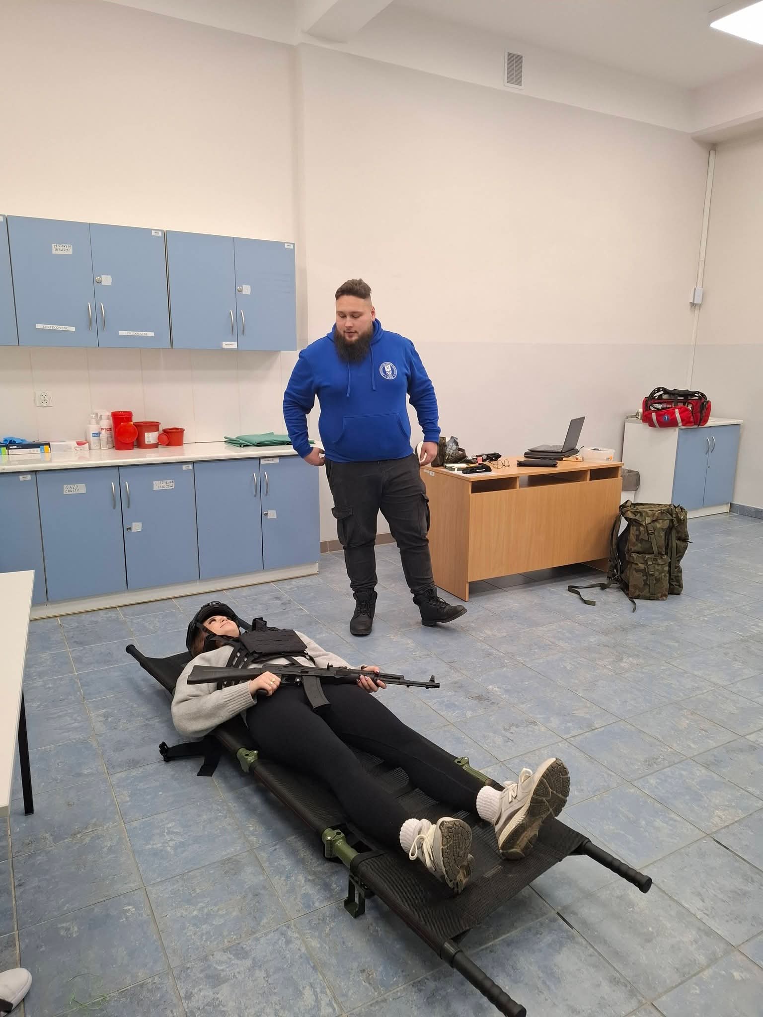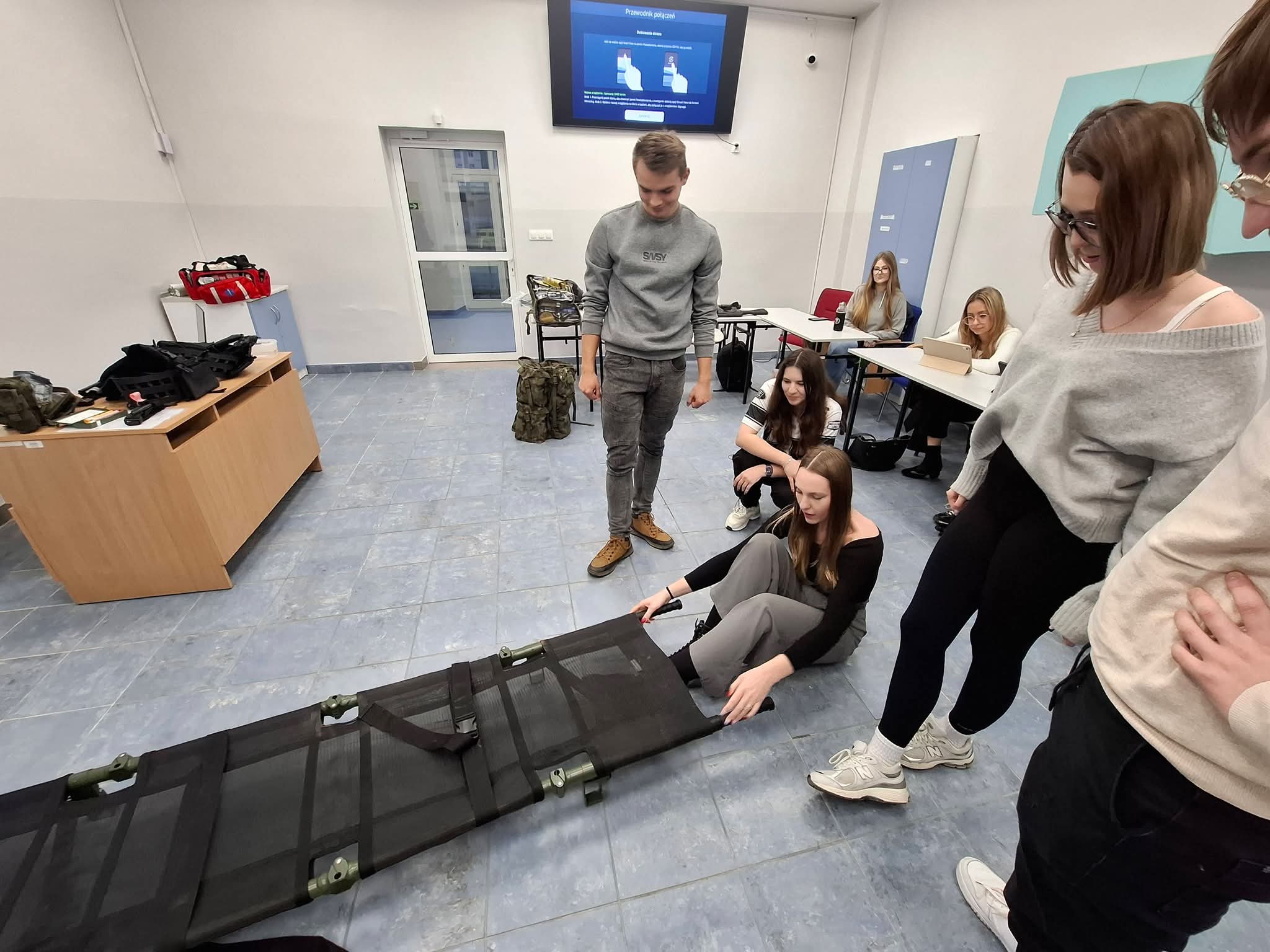 W części praktycznej ćwiczyliśmy prawidłowe przenoszenie poszkodowanego oraz podstawowe czynności z zakresu pierwszej pomocy. Mieliśmy również możliwość zapoznania się z torbą medyczną oraz wybranymi elementami wyposażenia wojskowego.