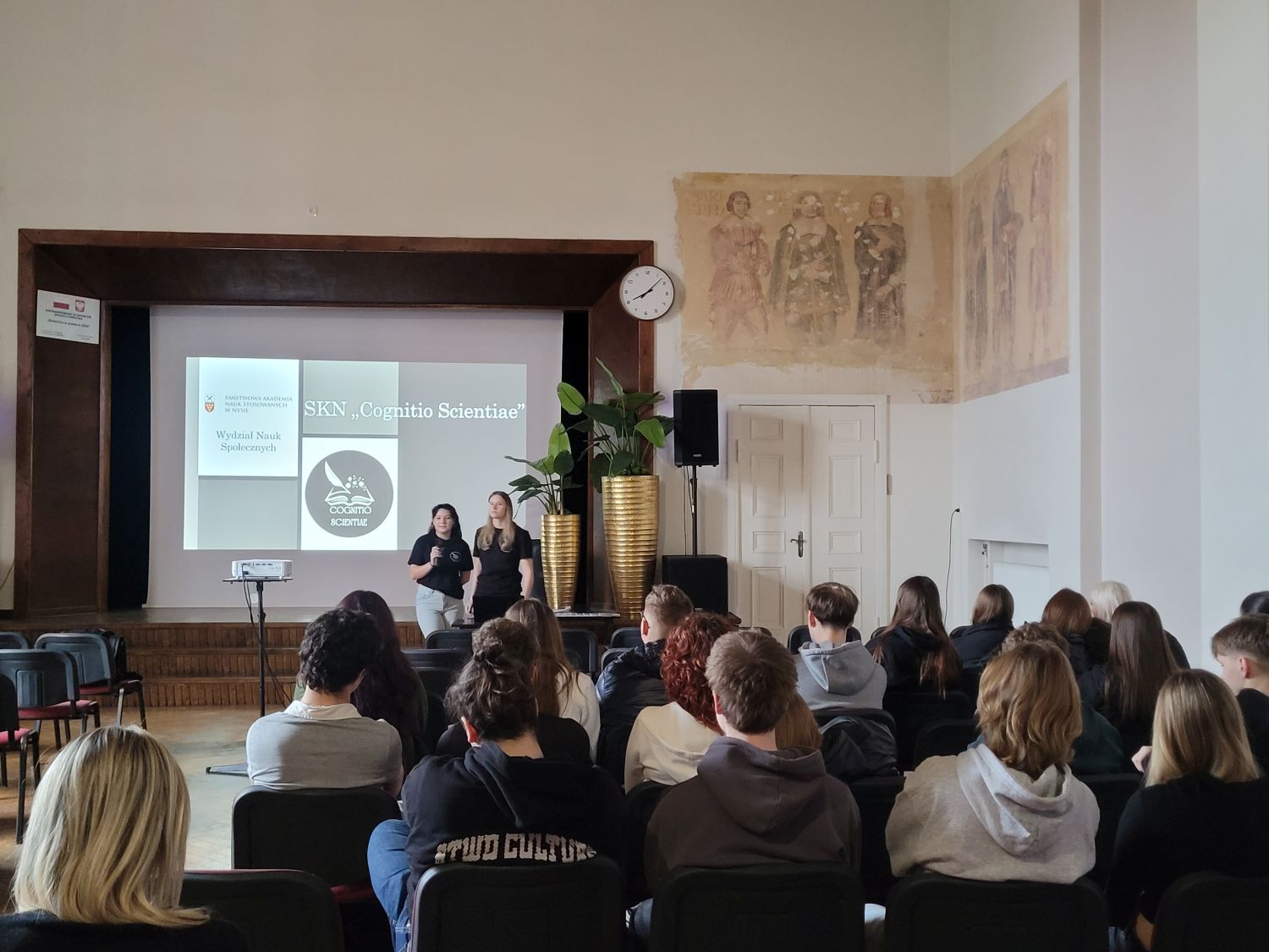 Pierwszą część spotkania stanowił wykład promocyjny prowadzony przez wykładowcę Wydziału Nauk Społecznych oraz Opiekuna Koła – dr. hab. inż. Marka Z. Kulisza, prof. ucz. Podczas wystąpienia prelegent przedstawił uczniom najważniejsze informacje dotyczące funkcjonowania Uczelni, omówił ofertę dydaktyczną Wydziału Nauk Społecznych oraz specjalizacje na kierunkach bezpieczeństwo wewnętrzne i administracja. Pan Profesor wskazał również możliwości rozwoju naukowego studentów, w tym prowadzenia badań i publikowania artykułów w ramach SKN „Cognitio Scientiae”.