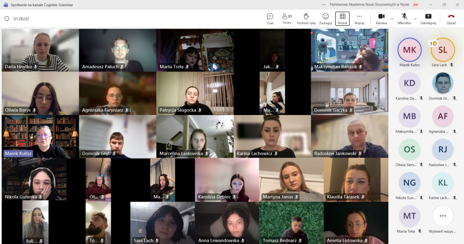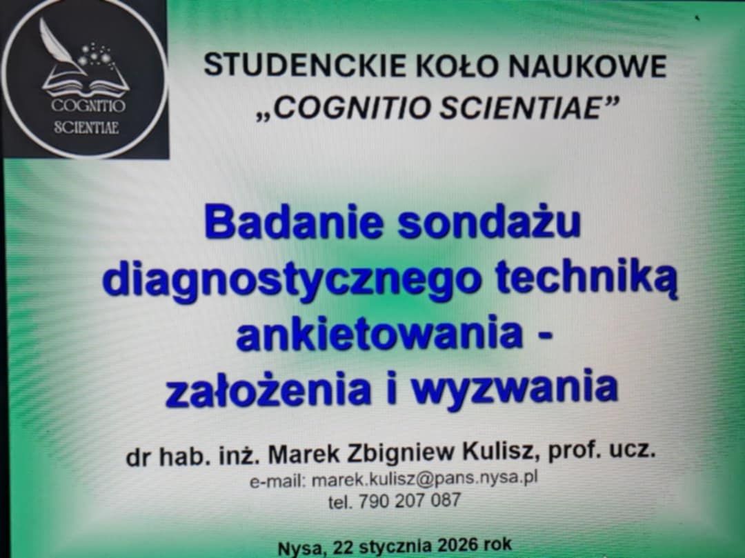 W dniu 22 stycznia 2026 r. członkowie SKN „Cognitio Scientiae” uczestniczyli w wykładzie pt. „Badanie sondażu diagnostycznego techniką ankietowania – wyzwania i zagrożenia”, który wygłosił dr hab. Marek Z. Kulisz, prof. ucz.