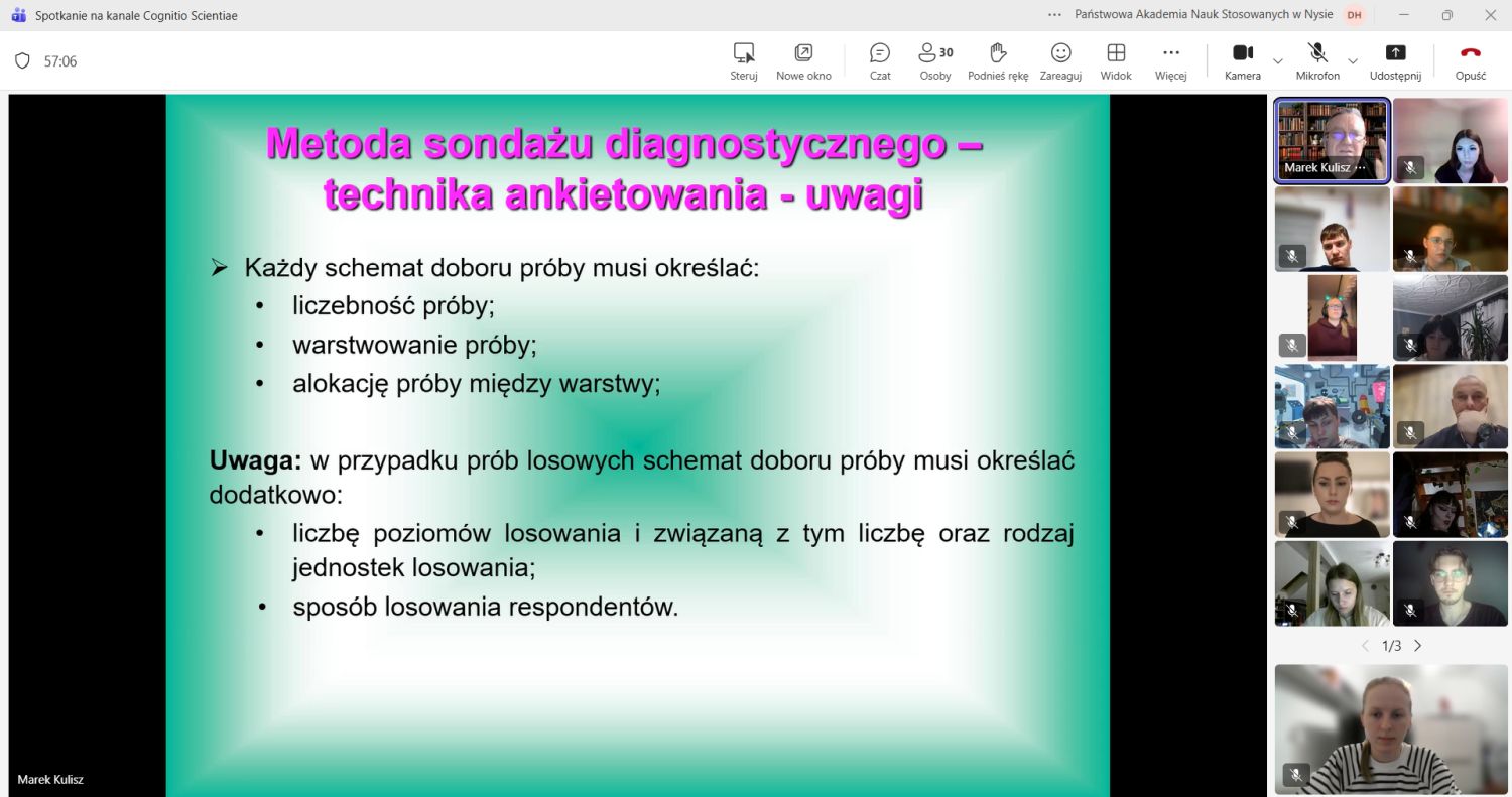 Prelegent przedstawił również słuchaczom poszczególne etapy realizacji niniejszego badania, w tym przygotowanie do badań, opracowywanie kwestionariusza ankiety oraz zasady obliczania minimalnej liczebności próby badawczej. W podsumowaniu wykładu przedstawiono główne założenia planowanego badania ankietowego, które przeprowadzą studenci należący do SKN „Cognitio Scientiae”.