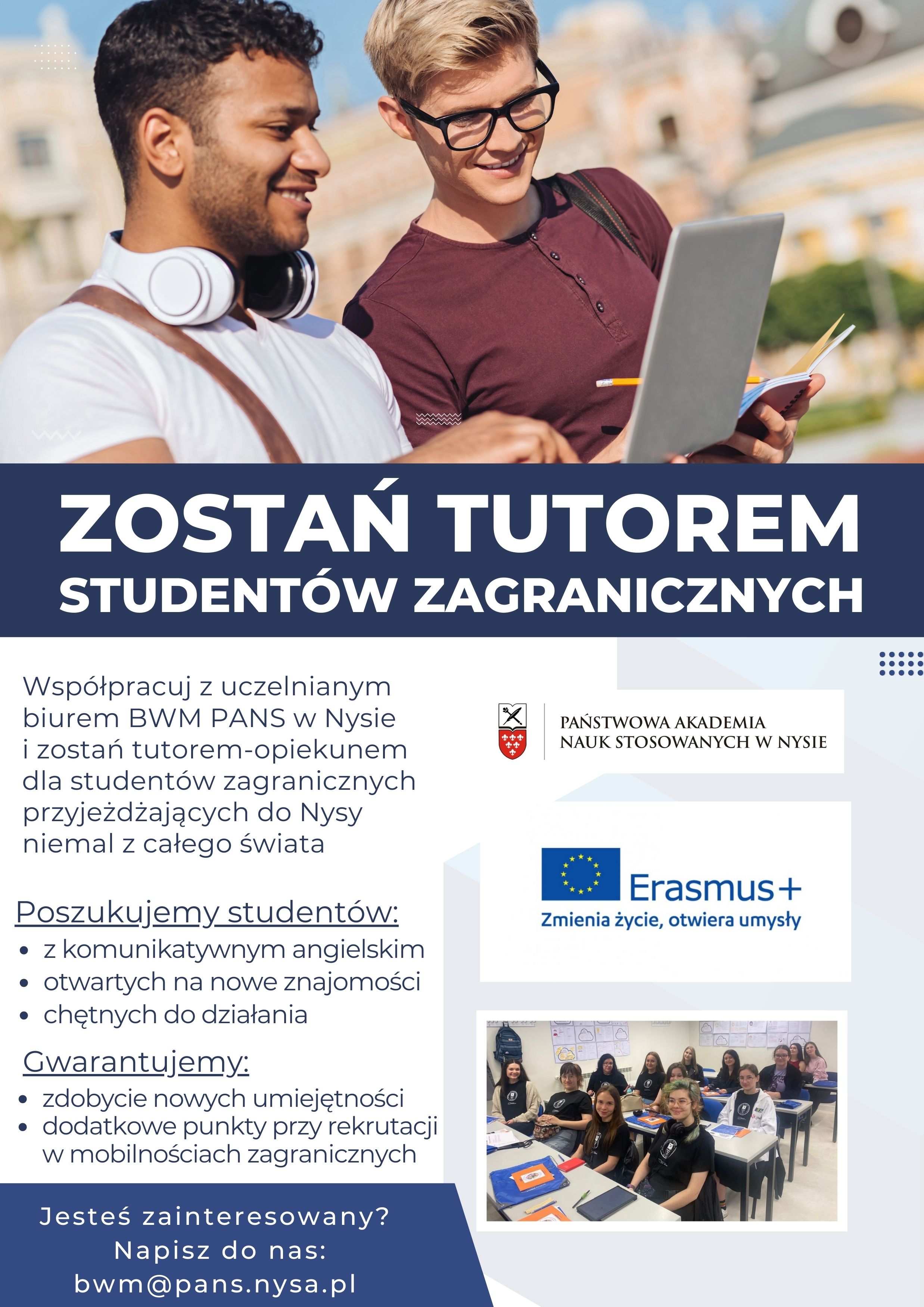 Czy chcielibyście zdobyć międzynarodowe doświadczenie, nowe znajomości i jednocześnie pomóc komuś poczuć się jak w domu? Jeśli tak – mamy dla Was świetną okazję! Zostań TUTOREM dla studentów zagranicznych przyjeżdżających do Nysy w ramach programu Erasmus+. To rola, w której stajesz się nie tylko przewodnikiem po uczelni i mieście, ale także wsparciem w codziennych sprawach oraz pierwszym kumplem w nowym kraju.