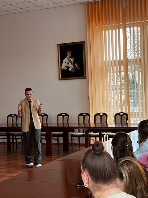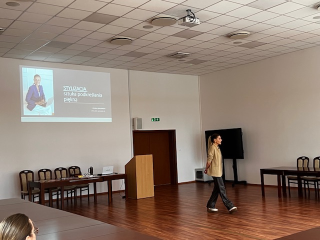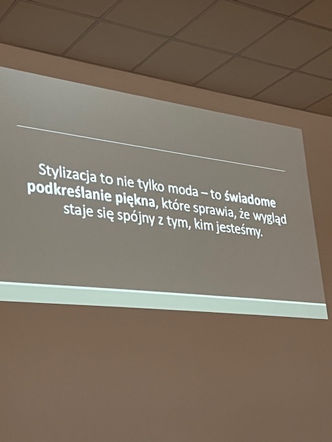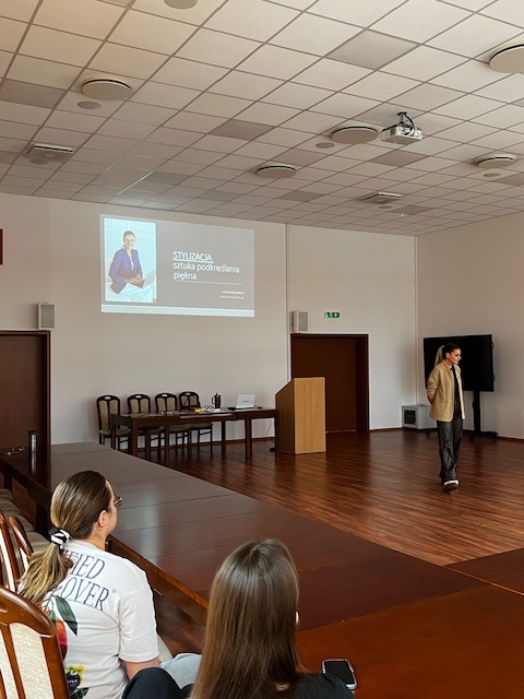 Spotkanie poprowadziła pani Sylvia Kozłowska – stylistka, kreatorka wizerunku oraz makijażystka, która w niezwykle ciekawy i inspirujący sposób przybliżyła uczestniczkom, na czym polega jej zawód. Podczas wykładu studentki dowiedziały się, jak ważną rolę odgrywa odpowiednio dobrany strój i makijaż, jak wpływają one na samopoczucie, pewność siebie oraz kondycję psychiczną, a także w jaki sposób profesjonalna stylistka pomaga budować spójny i świadomy wizerunek.