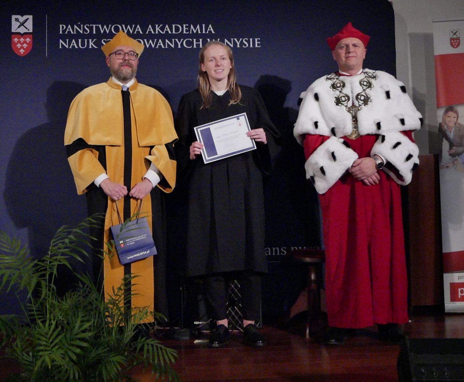 21-go listopada w Auli Uczelni miała miejsce uroczystość wręczenia dyplomów ukończenia studiów absolwentom studiów licencjackich na kierunkach administracja i bezpieczeństwo wewnętrzne oraz absolwentom studiów magisterskich na kierunku bezpieczeństwo wewnętrzne. Jego Magnificencja Rektor prof. Mariusz Kołosowski pogratulował absolwentom i podkreślił znaczenie ich kompetencji dla rozwoju rynku pracy, jak również dla lokalnego i regionalnego bezpieczeństwa. Dziekan Wydziału Nauk Społecznych prof. Tomasz Drewniak zwrócił uwagę na rolę Władz Uczelni, nauczycieli akademickich oraz pracowników administracji i obsługi dla sprawnego funkcjonowania Wydziału i komfortu studiowania. W imieniu absolwentów głos zabrali Pani lic. Magdalena Pasiniewicz oraz Pan mgr Jakub Płowucha, dziękując nauczycielom akademickim i promotorom oraz wskazując na wysoką jakość kształcenia i indywidualne podejście do studentów.