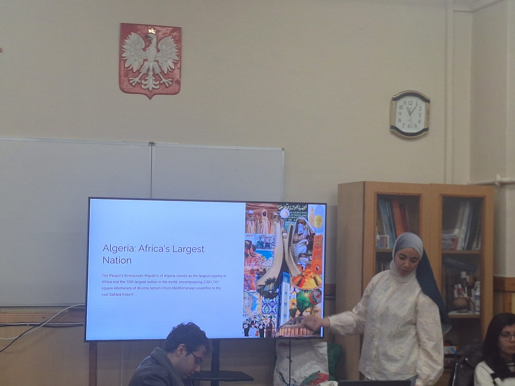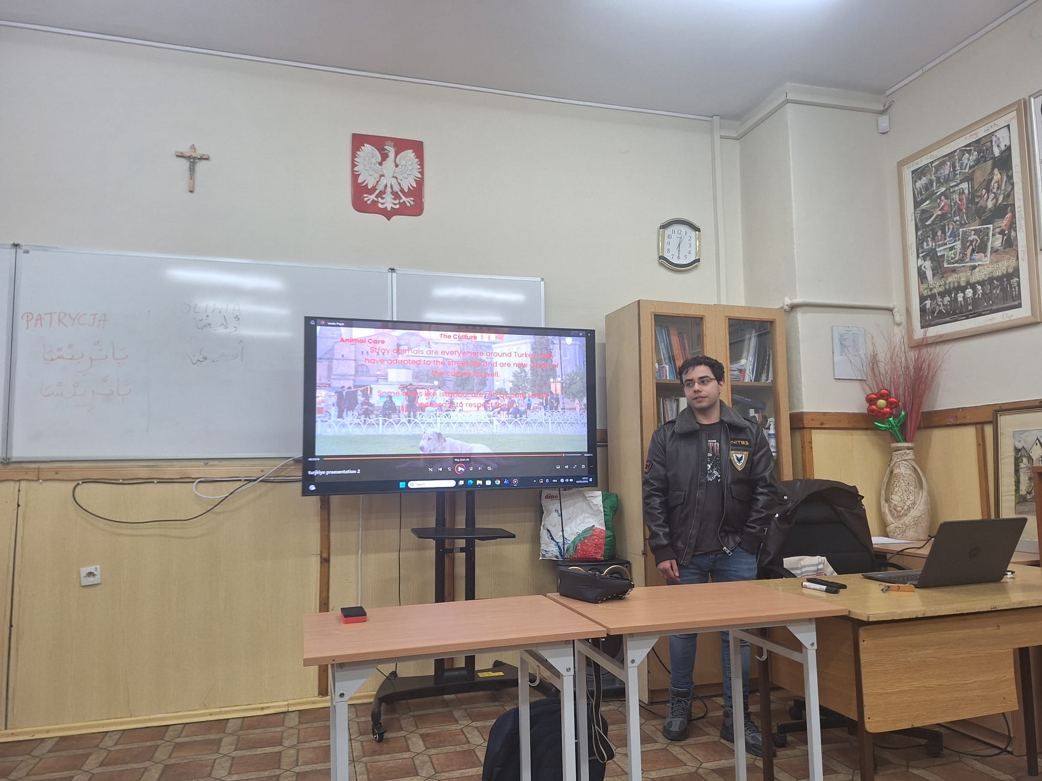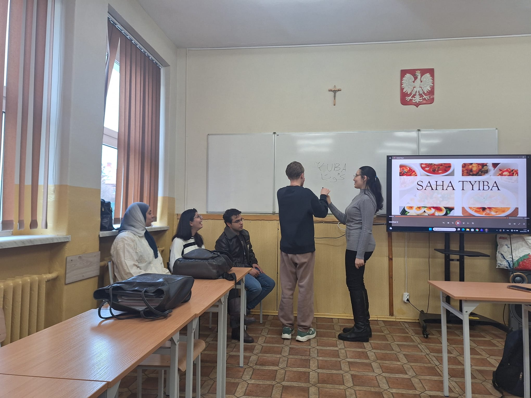 Goście przygotowali prezentacje w języku angielskim, podczas których opowiedzieli o swoich krajach, kulturze, tradycjach, a także o doświadczeniach związanych ze studiowaniem w Polsce i funkcjonowaniem w środowisku wielojęzycznym. Spotkanie miało charakter interaktywny – uczniowie chętnie zadawali pytania i włączali się w rozmowę, mając okazję sprawdzić swoje umiejętności językowe w praktyce.