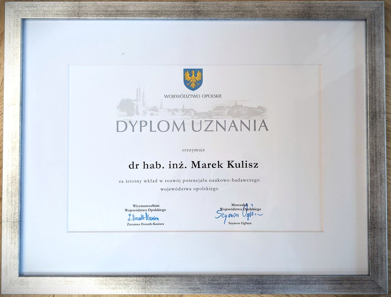 W związku z udziałem w konkursie, podczas Regionalnego Święta Nauki w Opolu Pan Profesor otrzymał z rąk Pani Wicemarszałek Województwa Opolskiego dyplom uznania. Wyróżnienie to podkreśla znaczący wkład Pana Profesora w rozwój nauk o bezpieczeństwie, a także jego aktywną działalność na rzecz budowania dialogu pomiędzy środowiskiem naukowym, administracją publiczną oraz praktykami.