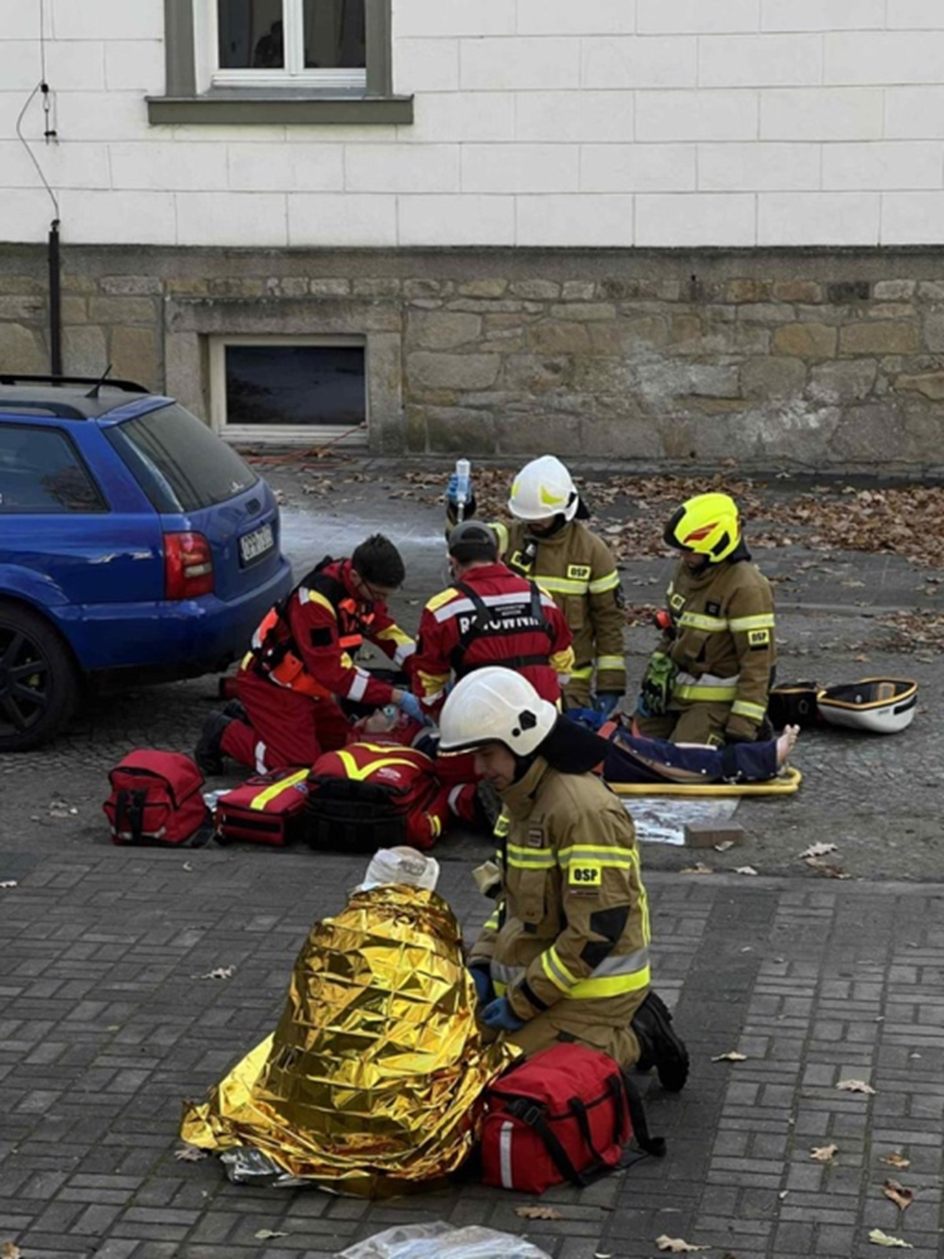 Pierwsi na miejscu byli strażacy-druhowie OSP i to oni zaczęli zaopatrywać rannych, w tym podjęli resuscytację krążeniowo-oddechową. Następnie na miejsce dojechał zespół ratownictwa medycznego, który przejął obowiązki: resuscytacja zaczęła być prowadzona wg protokołów zaawansowanych zabiegów resuscytacyjnych, oparzenia klatki piersiowej i twarzy zaopatrzono przy pomocy specjalistycznych opatrunków typu aquagel, a ranny, postrzelony zbadany i zabezpieczony w kierunku rozwijającego się wstrząsu hipowolemicznego. Ostatecznie resuscytacja zakończyła się powrotem spontanicznego krążenia i oddychania (tego poszkodowanego zabrał zespół Lotniczego Zespołu Ratownictwa Medycznego). Warto dodać, że śmigłowiec „wylądował” na dachu Collegium Medicum 😉
