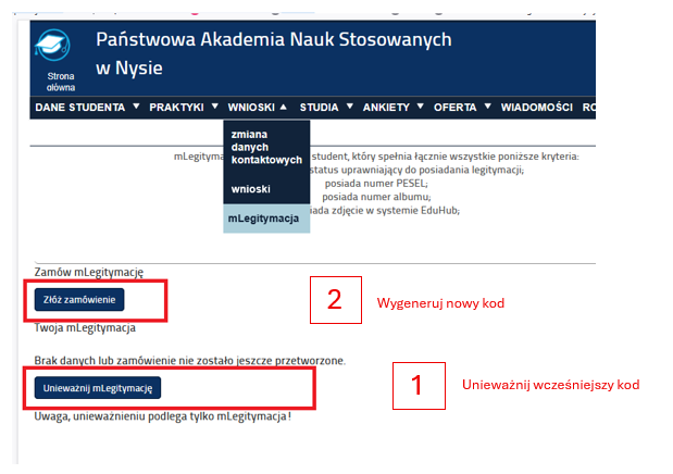 1. Unieważnij legitymację w Wirtualnej Uczelni (Wnioski/mLegitymacja).