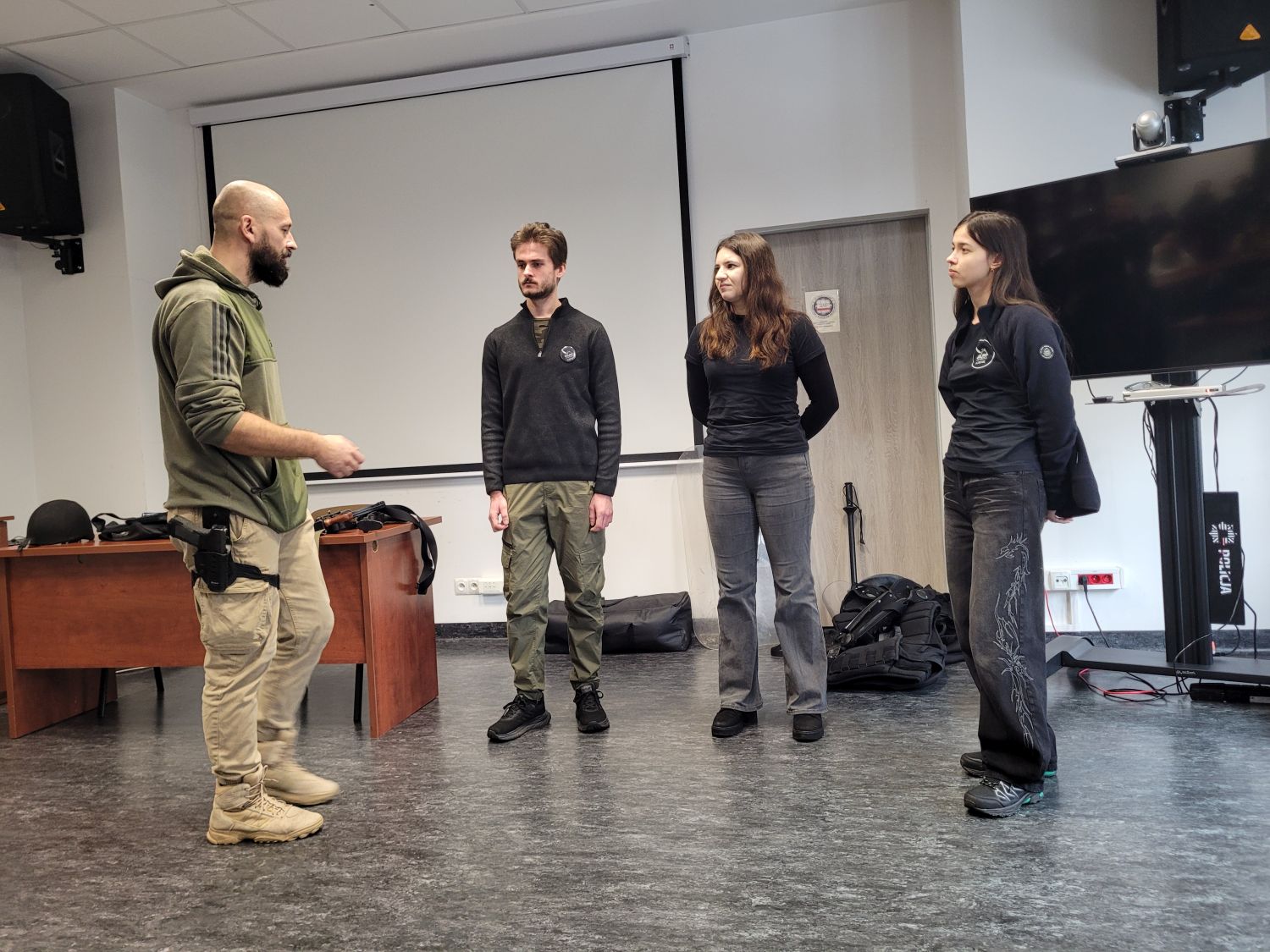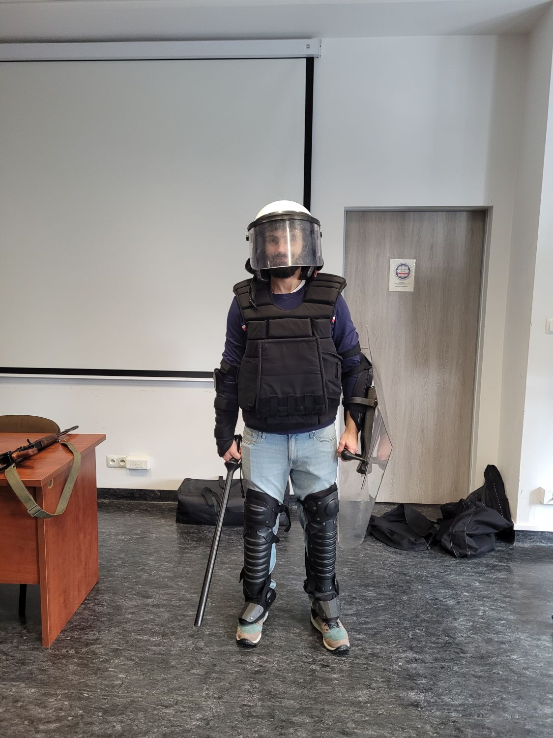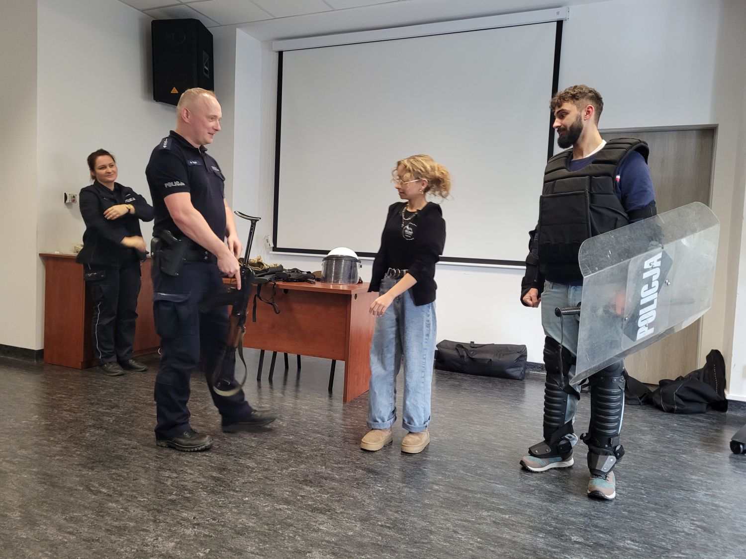 Na początku spotkania funkcjonariusz zaprezentował broń palną znajdującą się na wyposażeniu Policji, omówił jej właściwości techniczne, działania podejmowane przed użyciem broni oraz sytuacje, w których może być zastosowana zgodnie z przepisami prawa. Poruszono również zagadnienie związane z postępowaniem policjantów w przypadku zabezpieczania imprez masowych, w ramach czego zaprezentowano zestaw przeciwuderzeniowy („PZ/Żółwik”), który studenci mogli przymierzyć. Funkcjonariusze przedstawili także rolę dzielnicowych oraz ich znaczenie w procesie budowania poczucia bezpieczeństwa wśród mieszkańców powiatu nyskiego, a także najważniejsze zmiany wynikające ze znowelizowanej ustawy z dnia 29 lipca 2005 r. o przeciwdziałaniu przemocy domowej i procedurę zakładania „Niebieskiej Karty”. Ponadto, członkowie koła zostali zapoznani z zasadami corocznych testów sprawnościowych dla policjantów, konsekwencjami niezaliczenia poszczególnych etapów oraz elementami umundurowania służbowego, ćwiczebnego i galowego. Wizyta zakończyła się oprowadzeniem studentów po całej komendzie.