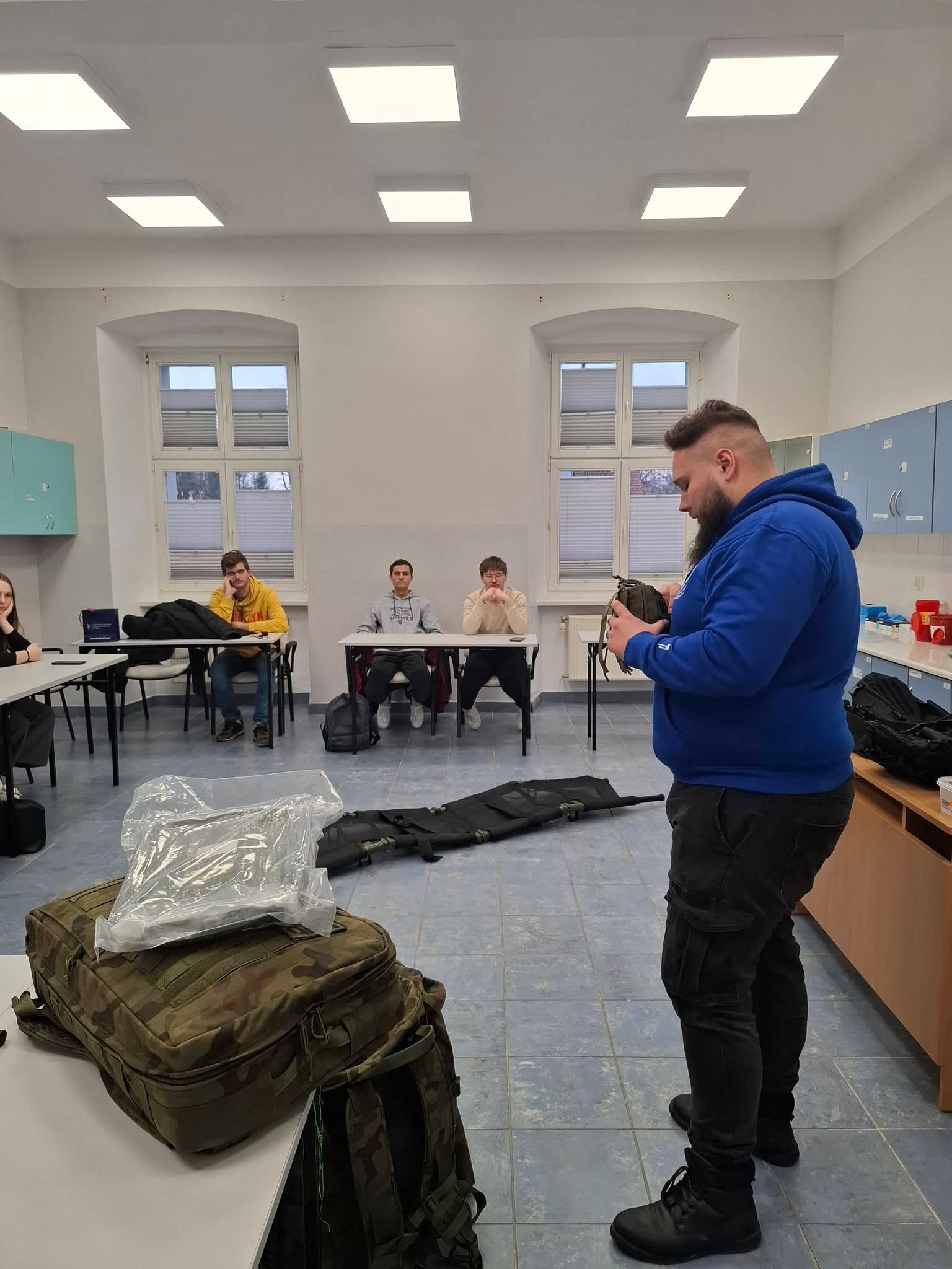 W części praktycznej ćwiczyliśmy prawidłowe przenoszenie poszkodowanego oraz podstawowe czynności z zakresu pierwszej pomocy. Mieliśmy również możliwość zapoznania się z torbą medyczną oraz wybranymi elementami wyposażenia wojskowego.