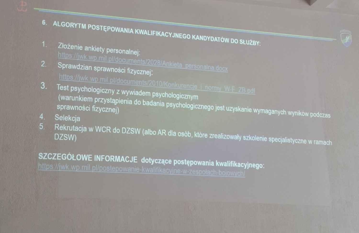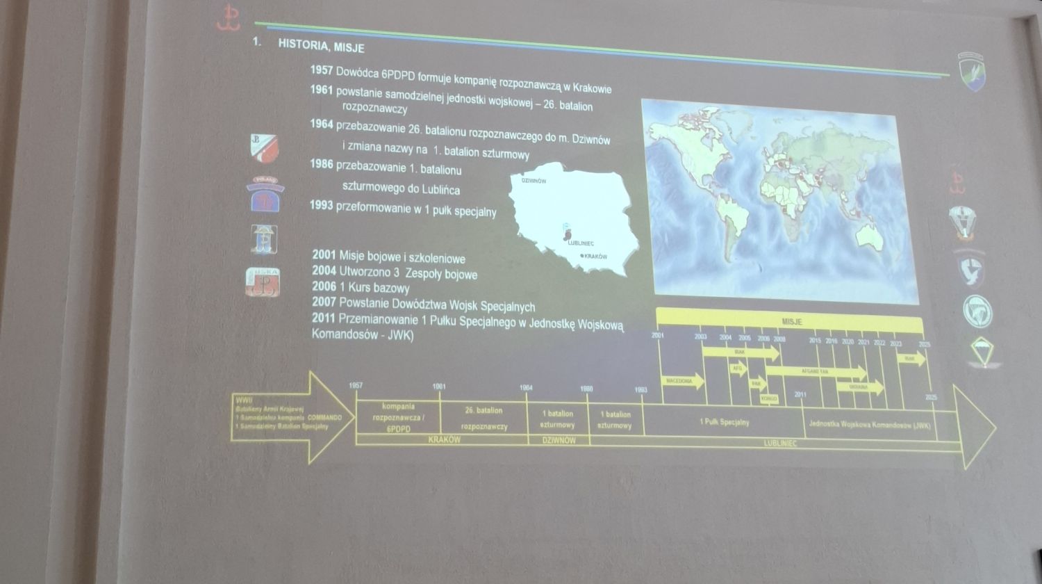 Podczas spotkania zaprezentowany został również proces rekrutacji do służby oraz omówiono historię, strukturę organizacyjną JKW w Lublińcu, jej zadania oraz osiągnięcia, w tym te w ramach misji zagranicznych.