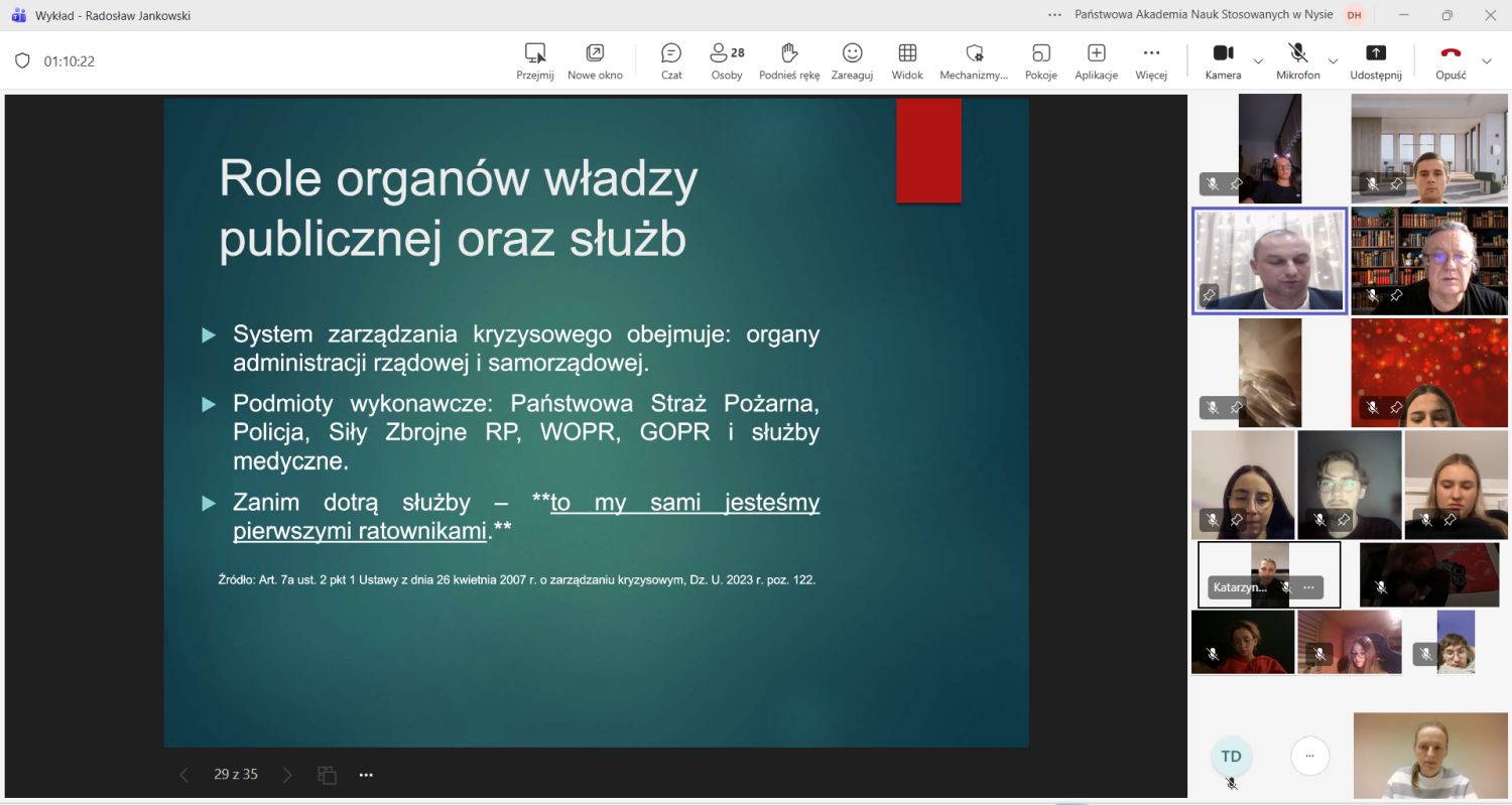 Uczestnicy mieli również okazję przypomnieć sobie obowiązujące sygnały w ramach systemu ostrzegania i alarmowania ludności cywilnej oraz zasady postępowania po ich ogłoszeniu. Następnie prelegent zwrócił uwagę na znaczenie pozytywnego nastawienia w sytuacjach kryzysowych oraz wskazał sposoby jego kształtowania. W ramach podsumowania wykładu omówiono rolę organów administracji samorządowej i rządowej, a także służb, inspekcji i straży w systemie zarządzania kryzysowego.