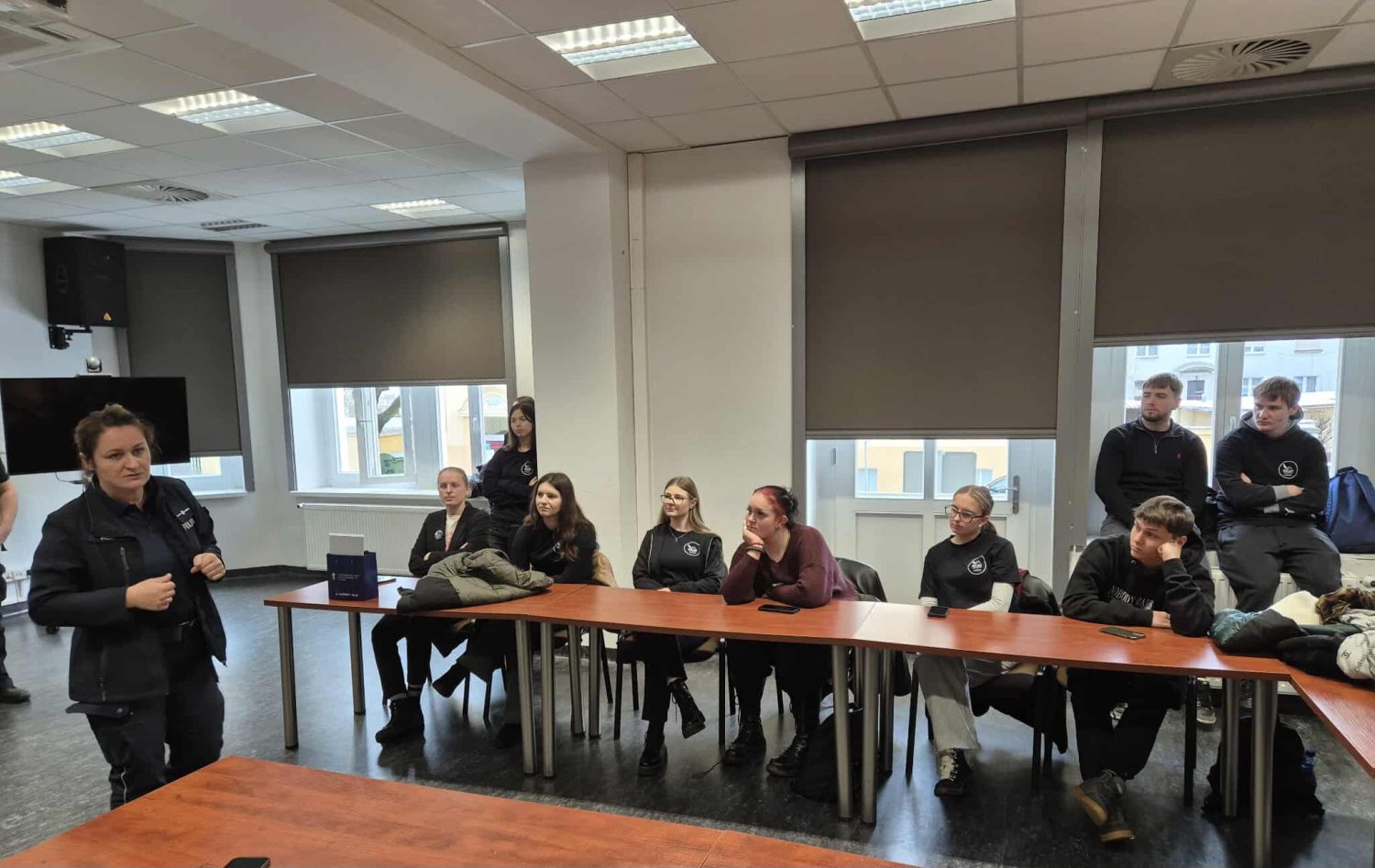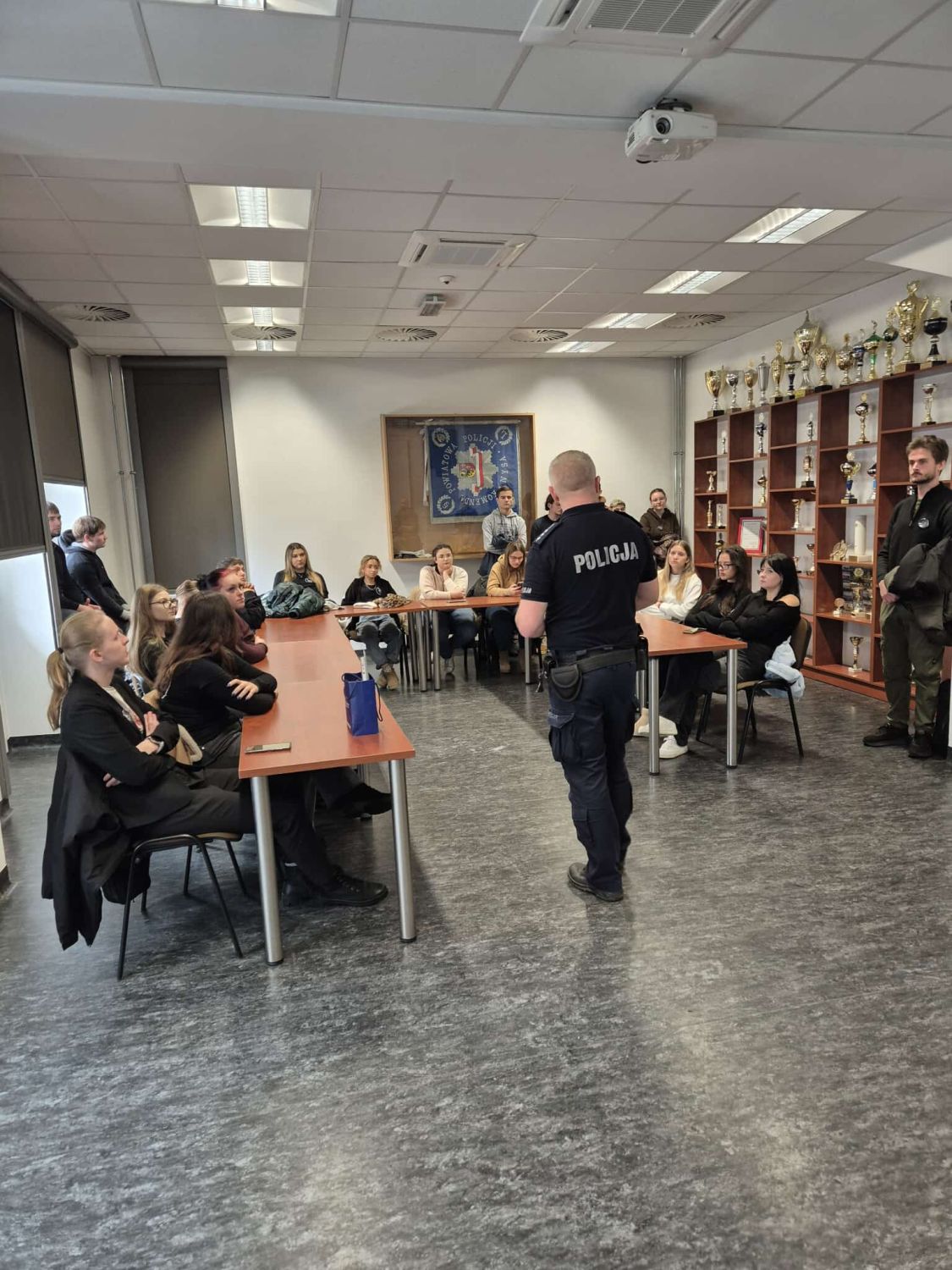 Na początku spotkania funkcjonariusz zaprezentował broń palną znajdującą się na wyposażeniu Policji, omówił jej właściwości techniczne, działania podejmowane przed użyciem broni oraz sytuacje, w których może być zastosowana zgodnie z przepisami prawa. Poruszono również zagadnienie związane z postępowaniem policjantów w przypadku zabezpieczania imprez masowych, w ramach czego zaprezentowano zestaw przeciwuderzeniowy („PZ/Żółwik”), który studenci mogli przymierzyć. Funkcjonariusze przedstawili także rolę dzielnicowych oraz ich znaczenie w procesie budowania poczucia bezpieczeństwa wśród mieszkańców powiatu nyskiego, a także najważniejsze zmiany wynikające ze znowelizowanej ustawy z dnia 29 lipca 2005 r. o przeciwdziałaniu przemocy domowej i procedurę zakładania „Niebieskiej Karty”. Ponadto, członkowie koła zostali zapoznani z zasadami corocznych testów sprawnościowych dla policjantów, konsekwencjami niezaliczenia poszczególnych etapów oraz elementami umundurowania służbowego, ćwiczebnego i galowego. Wizyta zakończyła się oprowadzeniem studentów po całej komendzie.