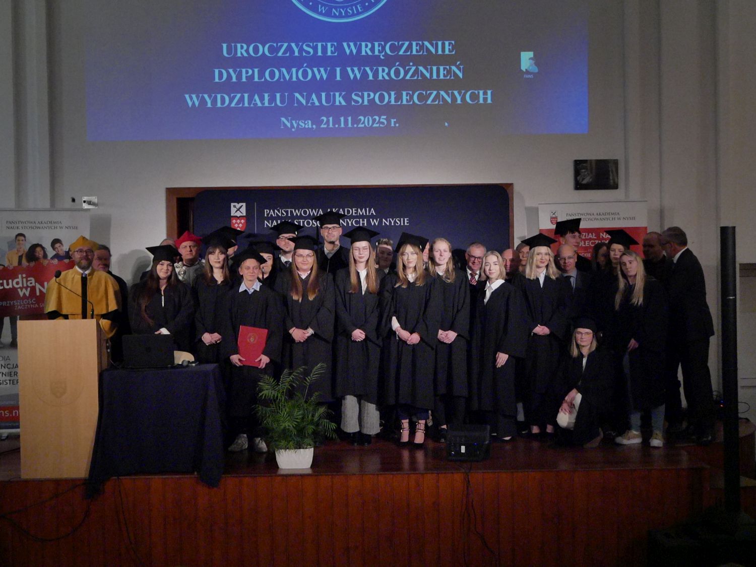 21-go listopada w Auli Uczelni miała miejsce uroczystość wręczenia dyplomów ukończenia studiów absolwentom studiów licencjackich na kierunkach administracja i bezpieczeństwo wewnętrzne oraz absolwentom studiów magisterskich na kierunku bezpieczeństwo wewnętrzne. Jego Magnificencja Rektor prof. Mariusz Kołosowski pogratulował absolwentom i podkreślił znaczenie ich kompetencji dla rozwoju rynku pracy, jak również dla lokalnego i regionalnego bezpieczeństwa. Dziekan Wydziału Nauk Społecznych prof. Tomasz Drewniak zwrócił uwagę na rolę Władz Uczelni, nauczycieli akademickich oraz pracowników administracji i obsługi dla sprawnego funkcjonowania Wydziału i komfortu studiowania. W imieniu absolwentów głos zabrali Pani lic. Magdalena Pasiniewicz oraz Pan mgr Jakub Płowucha, dziękując nauczycielom akademickim i promotorom oraz wskazując na wysoką jakość kształcenia i indywidualne podejście do studentów.