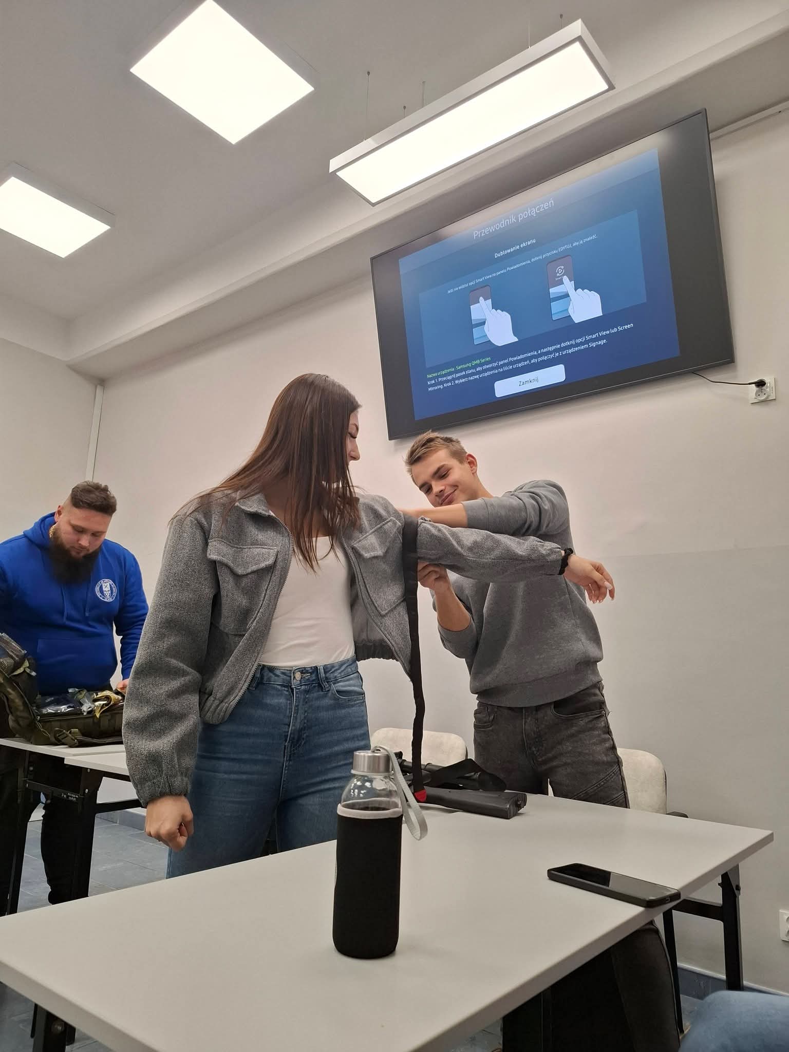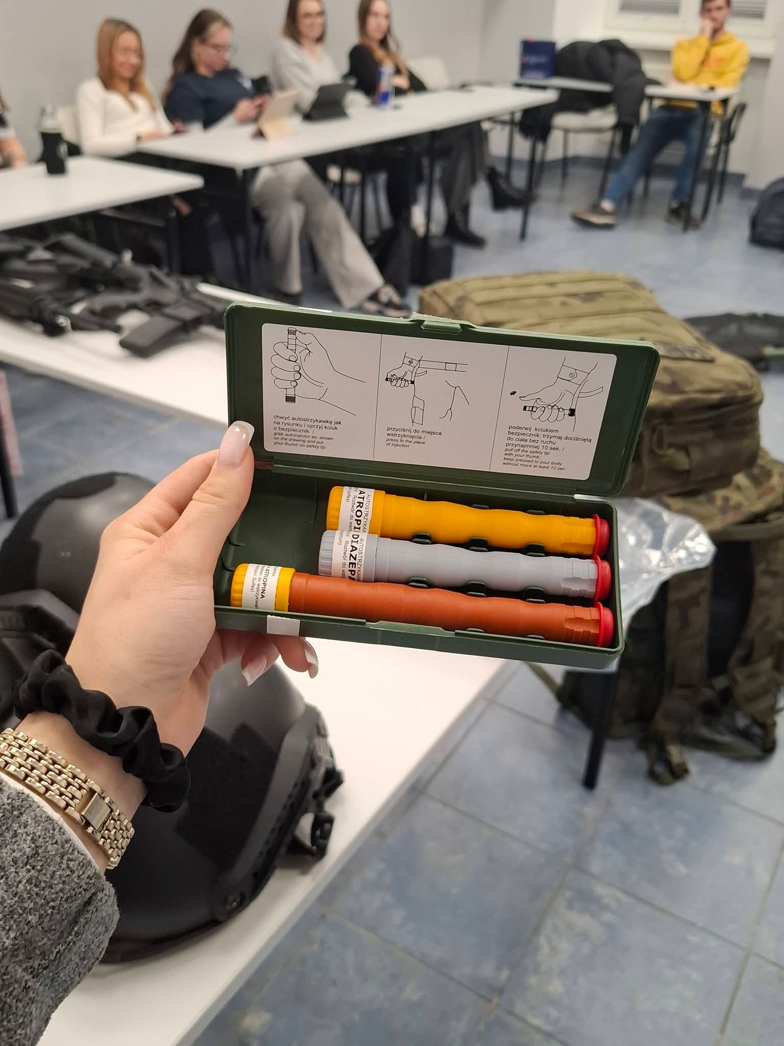 W części praktycznej ćwiczyliśmy prawidłowe przenoszenie poszkodowanego oraz podstawowe czynności z zakresu pierwszej pomocy. Mieliśmy również możliwość zapoznania się z torbą medyczną oraz wybranymi elementami wyposażenia wojskowego.