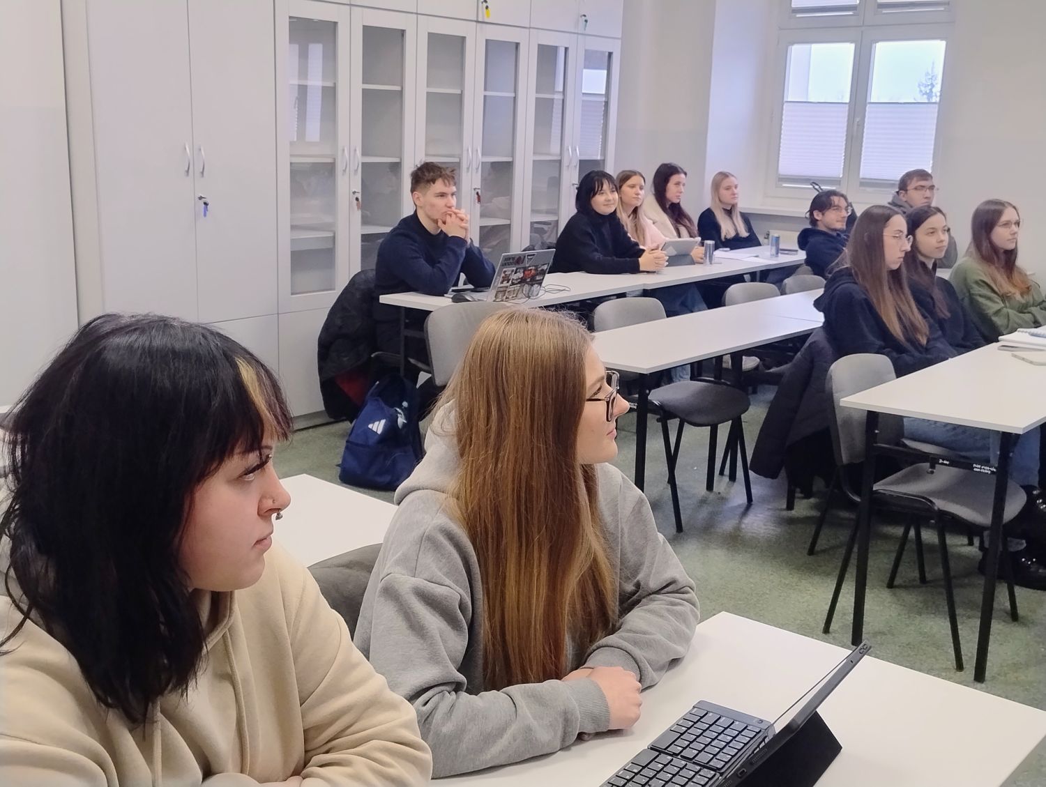 We wtorek 13 stycznia studenci II roku bezpieczeństwa wewnętrznego w ramach zajęć z "Bezpieczeństwa społecznego" wzięli udział w warsztatach przeprowadzonych przez doradców zawodowych Powiatowego Urzędu Pracy w Nysie: panie Natalię Wielgus oraz Agnieszkę Wajdzik. Pracownice Urzędu zwróciły uwagę studentom co zrobić, aby po skończeniu studiów bez problemu znaleźć wymarzoną pracę. Ważną rzeczą jest zdobywanie dodatkowych kompetencji, praca już podczas studiów czy zagraniczne wyjazdy w ramach wymiany studenckiej. Studenci z zainteresowaniem słuchali przekazywanych treści oraz chętnie wypełniali zaproponowane quizy i zagadki logiczne. Dowiedzieli się, co to jest barometr zawodów i jakie będą kompetencje przyszłości. Panie przedstawiły studentom także możliwości wsparcia ze strony Urzędu dla młodych ludzi w zakresie stażów, szkoleń czy innych form wsparcia.