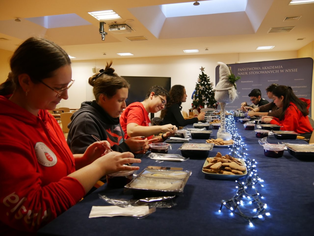 Zwieńczeniem wydarzenia było wspólne dekorowanie wcześniej upieczonych pierniczków, które z dużym zaangażowaniem przygotowały studentki z Samorządu Studenckiego PANS w Nysie organizując warsztaty z wypieku staropolskich pierniczków.