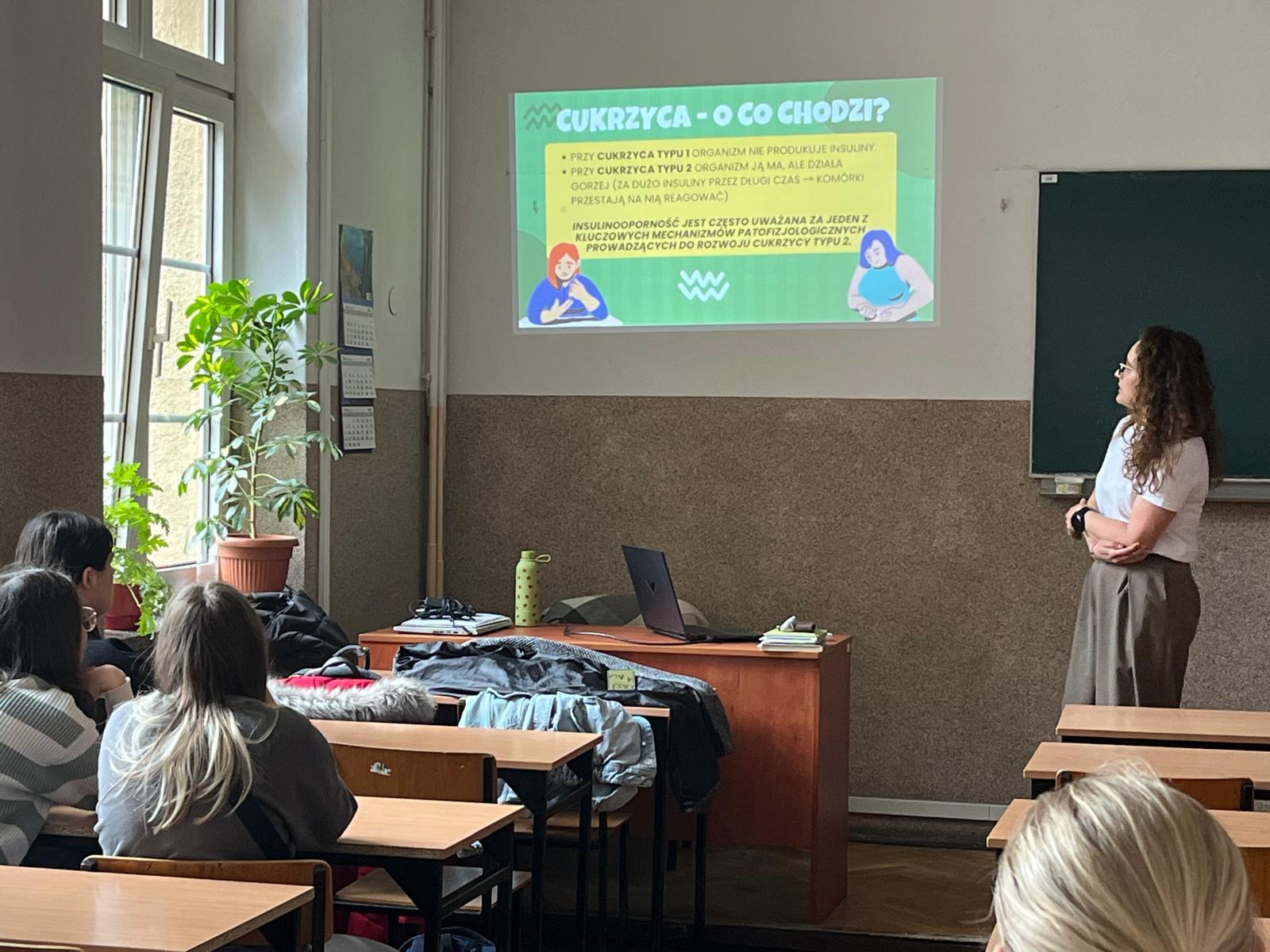 Studentki Koła Naukowego EDUKATORZY ŻYWIENIA Lucyna Kwiczala oraz Sandra Kamińska, miały przyjemność poprowadzić prelekcję dla uczniów w CZKiU w Nysie 😊 Spotkanie dotyczyło niezwykle ważnych zagadnień, takich jak energia z pożywienia, insulinooporność oraz cukrzyca. Cieszy nas ogromnie, że młodzi ludzie tak aktywnie uczestniczyli w zajęciach – nie brakowało pytań, zaangażowania i ciekawych dyskusji! Podsumowaniem naszej prelekcji było wspólne komponowanie zdrowego talerza 🥗, które pozwoliło uczniom w praktyczny sposób wykorzystać zdobytą wiedzę.