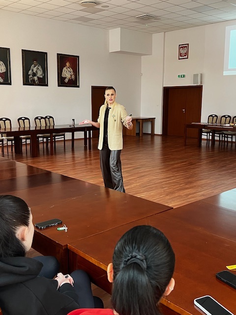 Spotkanie poprowadziła pani Sylvia Kozłowska – stylistka, kreatorka wizerunku oraz makijażystka, która w niezwykle ciekawy i inspirujący sposób przybliżyła uczestniczkom, na czym polega jej zawód. Podczas wykładu studentki dowiedziały się, jak ważną rolę odgrywa odpowiednio dobrany strój i makijaż, jak wpływają one na samopoczucie, pewność siebie oraz kondycję psychiczną, a także w jaki sposób profesjonalna stylistka pomaga budować spójny i świadomy wizerunek.