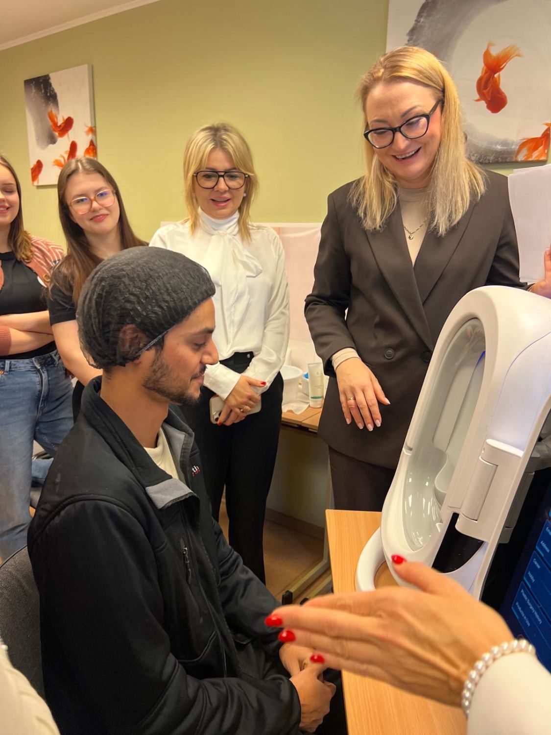 Szczególnym zainteresowaniem cieszyły się warsztaty diagnostyczne z użyciem PHANTOM MD, umożliwiające analizę stanu skóry w oparciu o wielospektralne obrazy. Uczestniczki odwiedziły także klinikę „EVA Clinic”, prowadzoną przez absolwentkę DU, poznając praktyczne zastosowania omawianych metod w pracy gabinetu kosmetologicznego.