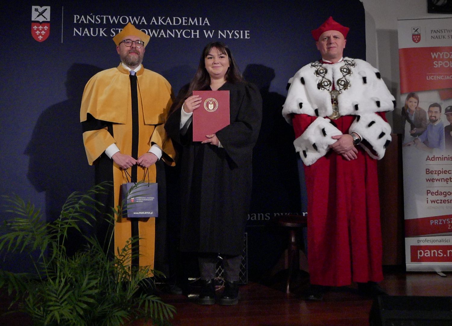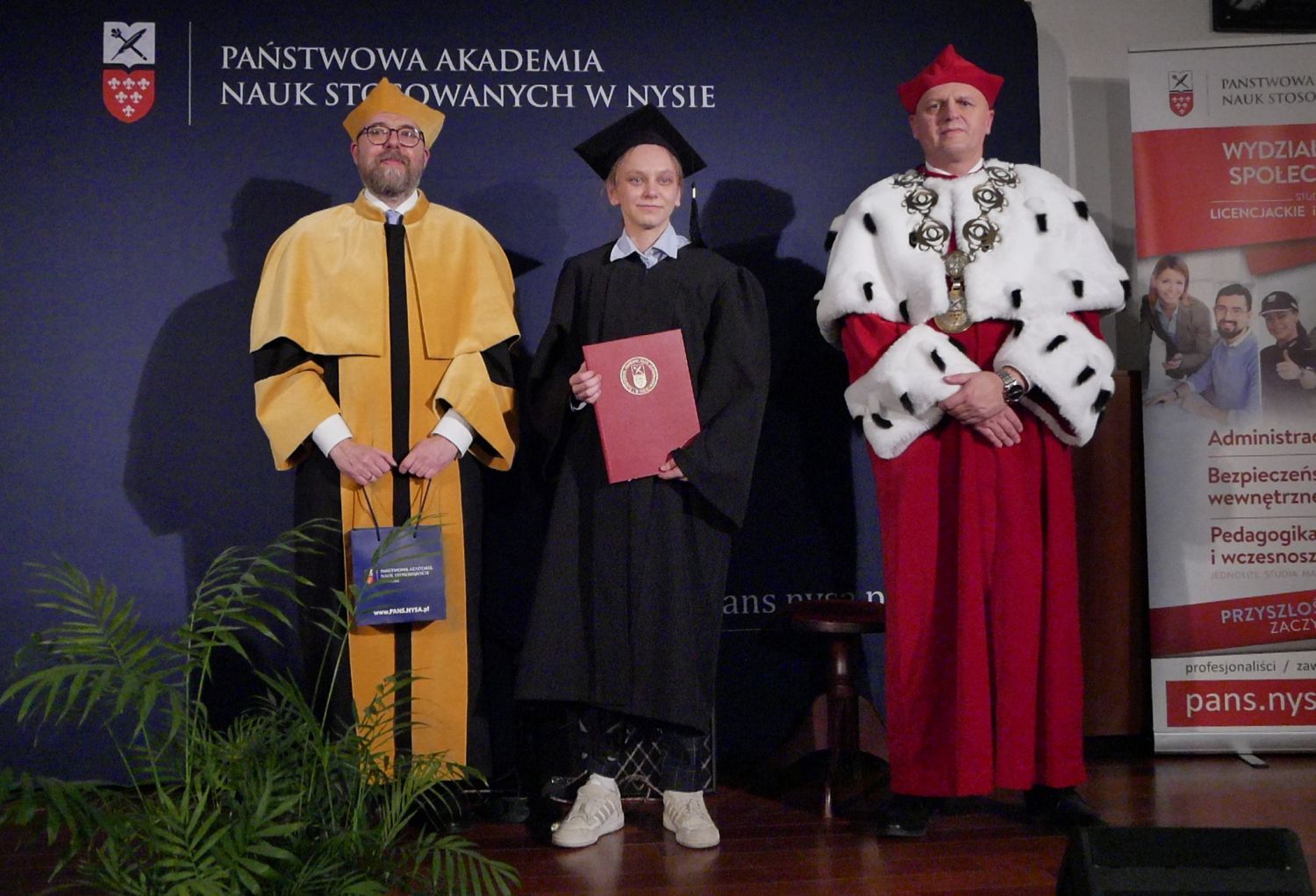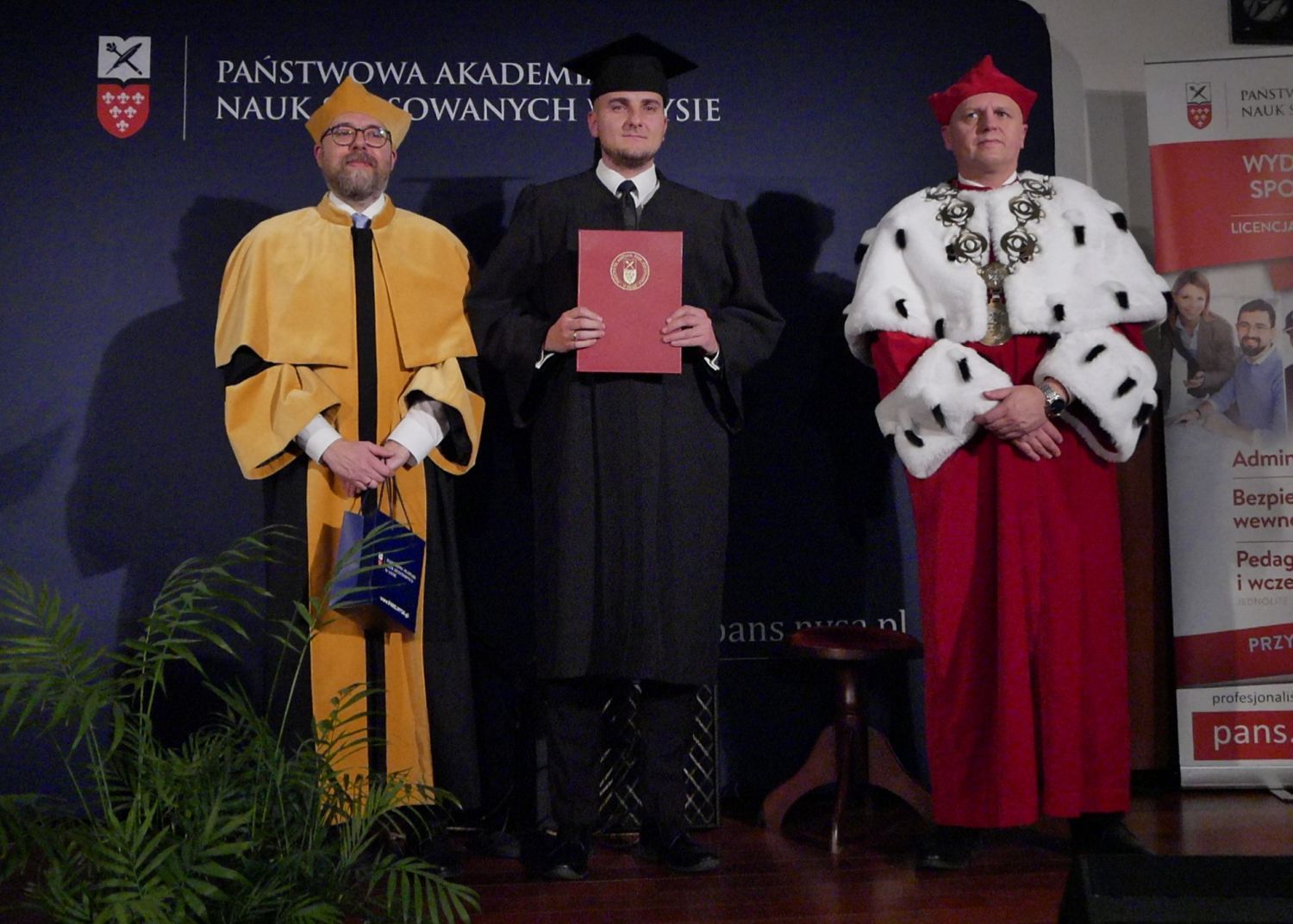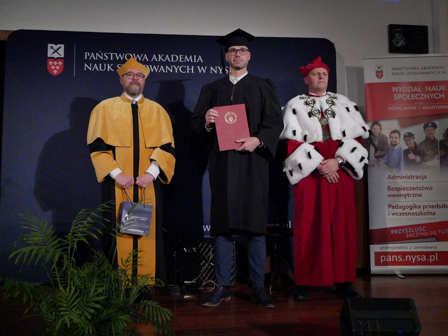 21-go listopada w Auli Uczelni miała miejsce uroczystość wręczenia dyplomów ukończenia studiów absolwentom studiów licencjackich na kierunkach administracja i bezpieczeństwo wewnętrzne oraz absolwentom studiów magisterskich na kierunku bezpieczeństwo wewnętrzne. Jego Magnificencja Rektor prof. Mariusz Kołosowski pogratulował absolwentom i podkreślił znaczenie ich kompetencji dla rozwoju rynku pracy, jak również dla lokalnego i regionalnego bezpieczeństwa. Dziekan Wydziału Nauk Społecznych prof. Tomasz Drewniak zwrócił uwagę na rolę Władz Uczelni, nauczycieli akademickich oraz pracowników administracji i obsługi dla sprawnego funkcjonowania Wydziału i komfortu studiowania. W imieniu absolwentów głos zabrali Pani lic. Magdalena Pasiniewicz oraz Pan mgr Jakub Płowucha, dziękując nauczycielom akademickim i promotorom oraz wskazując na wysoką jakość kształcenia i indywidualne podejście do studentów.