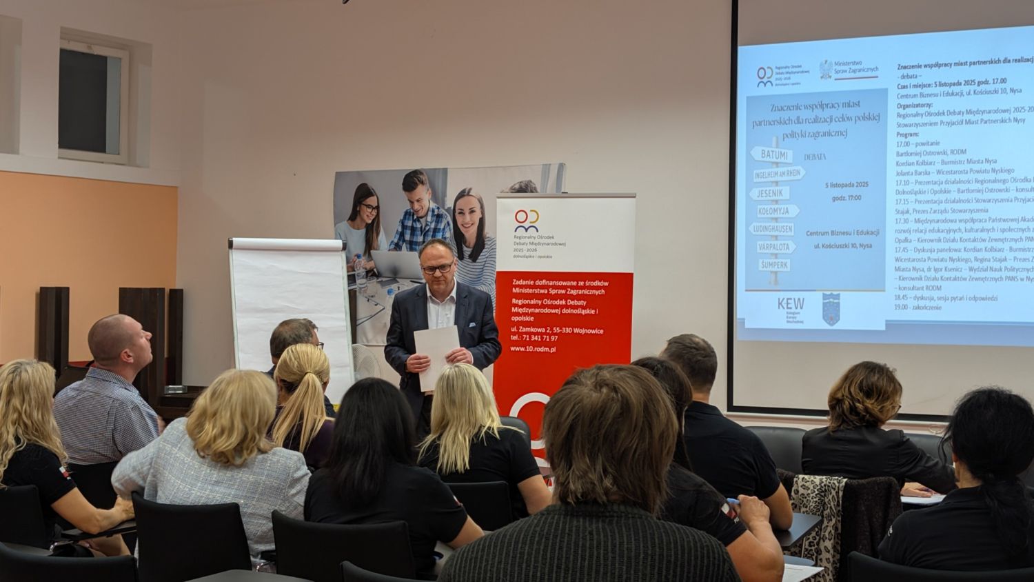 5 listopada 2025 roku w Centrum Biznesu i Edukacji w Nysie odbyła się debata zorganizowana przez Regionalny Ośrodek Debaty Międzynarodowej RODM pt. „Znaczenie współpracy miast partnerskich dla realizacji celów polskiej polityki zagranicznej”.